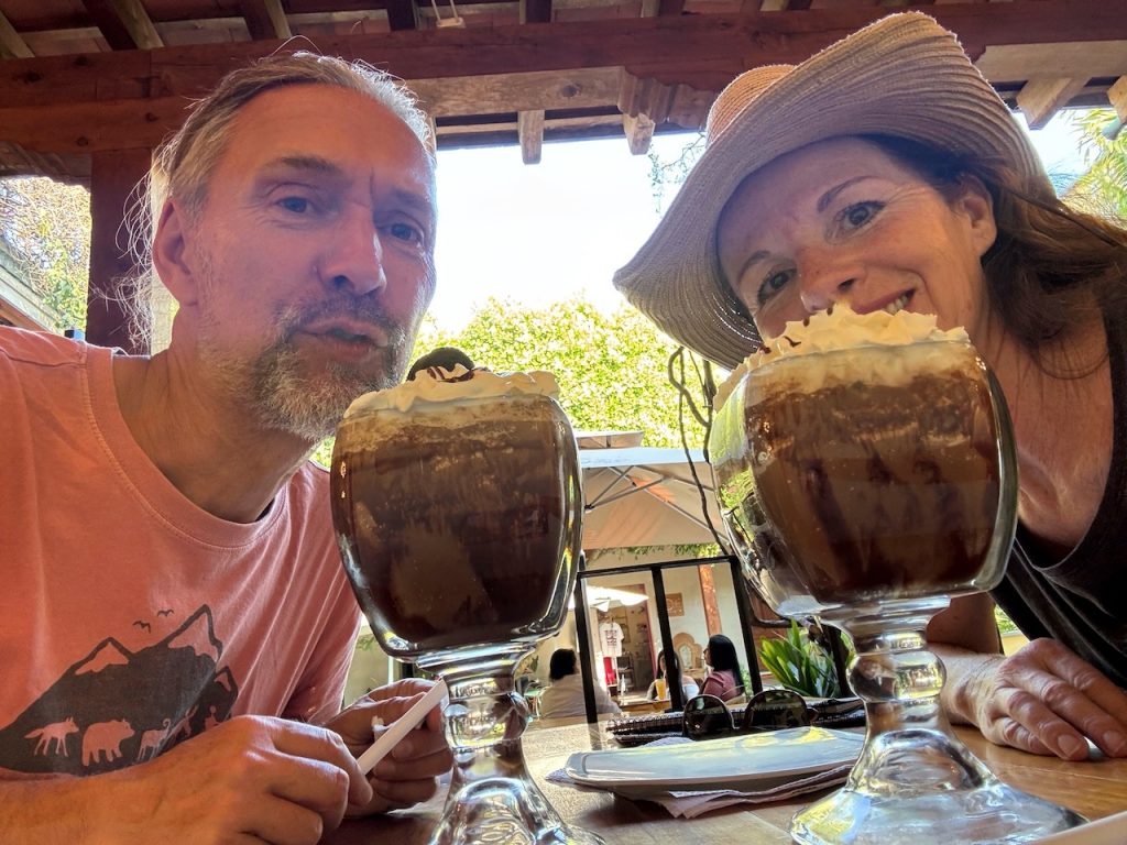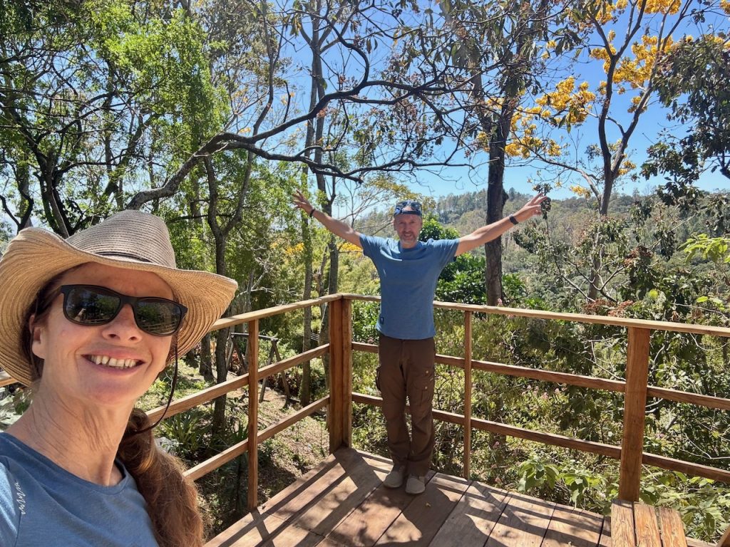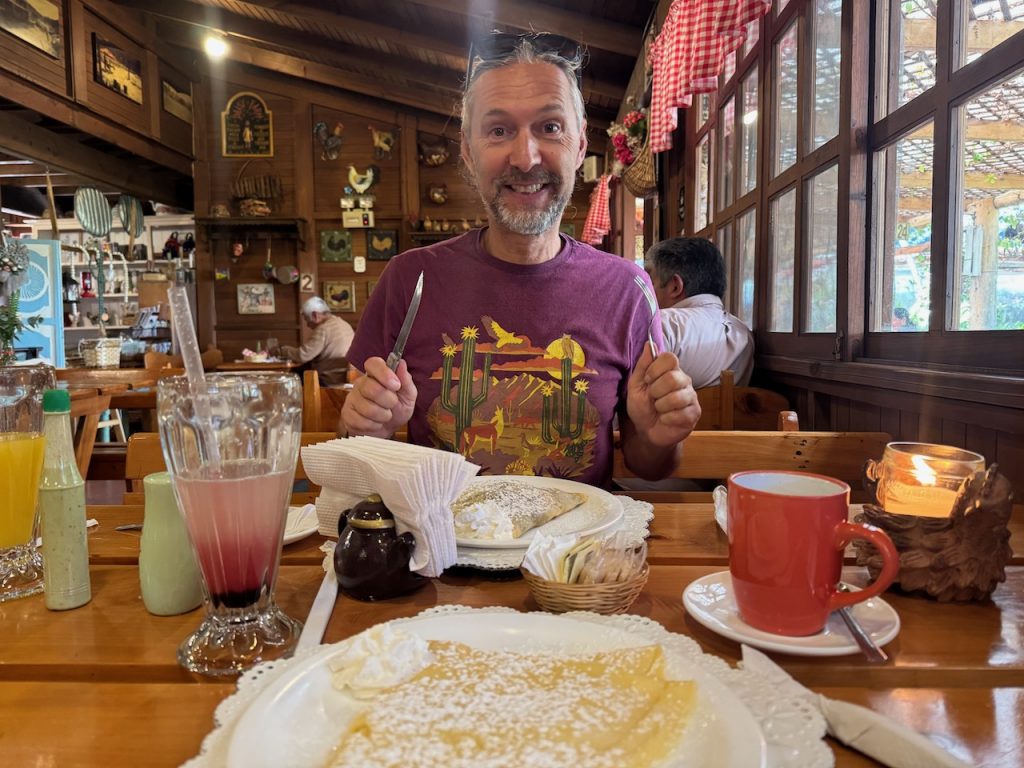 A few days later, we drive down into lower-lying regions again, stopping overnight at „our“ Mirador viewpoint. Unfortunately, we have to go through Huehue again—but this time, although the journey is slow, it’s relatively relaxed. We spent the night behind a gas station, well-guarded by a rifle-wielding „deputy sheriff,“ and after a surprisingly quiet night there, we continue our journey on a fantastic road (CA-1) towards Antigua. Along the way, we find a lovely restaurant with delicious frapucchinos and crepes. We ask if we can stay overnight—and of course, they say yes. Everyone is so warm, helpful, and kind to us. We are simply spoiled.