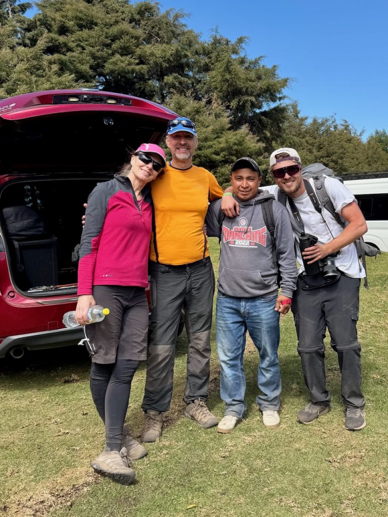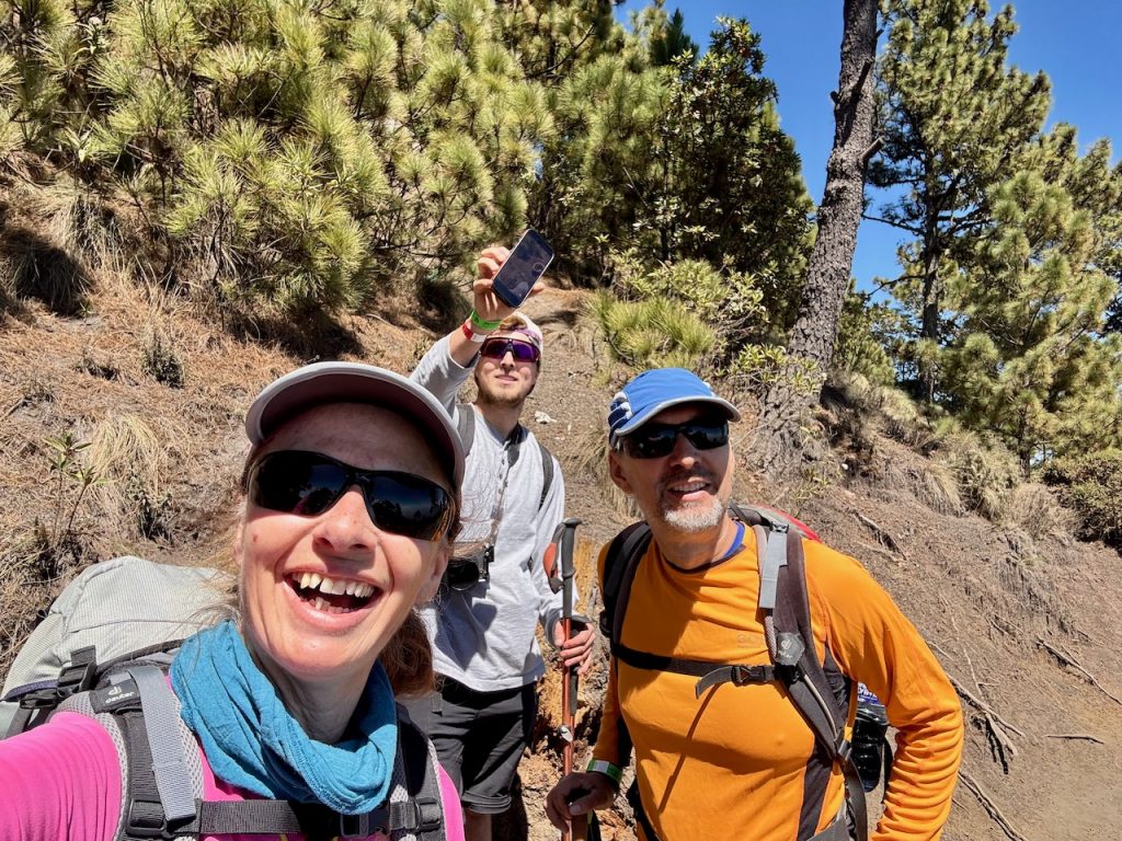 The beginning is awful, a steep climb on a narrow, dusty path between barbed wire fences. We encounter a lot of hikers coming down from above, which isn’t much fun. After about 1 mile, we reach the forest, and from then on, we don’t see as many hikers coming the other way. So, the four of us spend the next 4 miles (to base camp) on the mostly steep and quite challenging trail. However, we feel strong and full of energy the whole time—unlike Dylan, who’s simply carrying too much gear. Our fantastic guide, Hibierto, relieves him early on, and so Dylan, who soon adopts us, makes it up without any problems. He’s been commissioned to film a new promotional video for our tour operator—something we’re also looking forward to, as we’ll likely be quite visible.