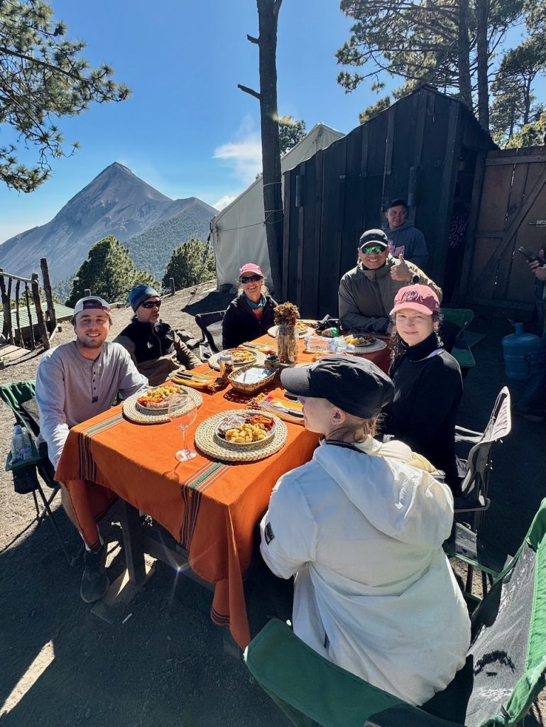 After just under 3.5 hours, we arrive at base camp and immediately enjoy a cold beer with a magnificent view. It’s still very quiet on Acatenango, as most of the groups don’t start their ascent until two hours later and usually take longer. Our camp at 11,820 feet is absolutely wonderful and comfortable, with a fantastic view of Fuego. The active volcanic crater is now only about 1.4 miles away as the crow flies. Hibierto is preparing lunch, and after about an hour, three more guests arrive, having been driven up in a 4×4. Now there are six of us, and we all get along fantastically right away and have a great time together.