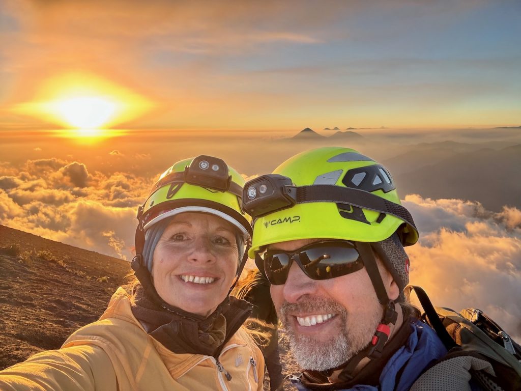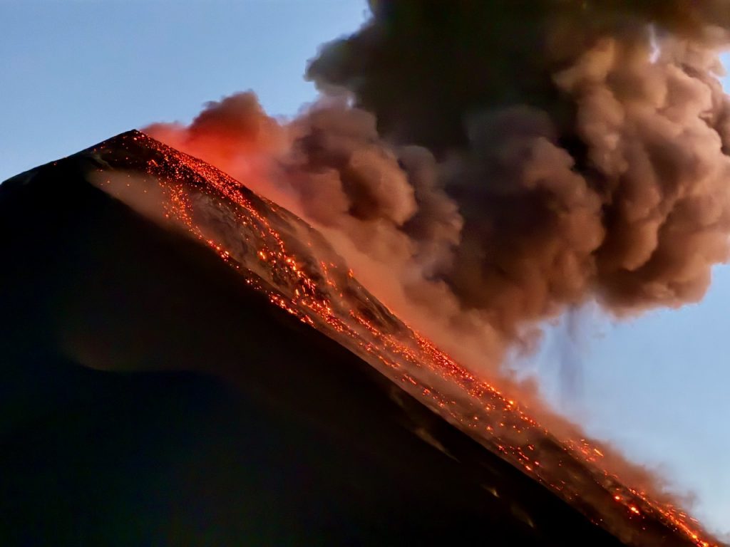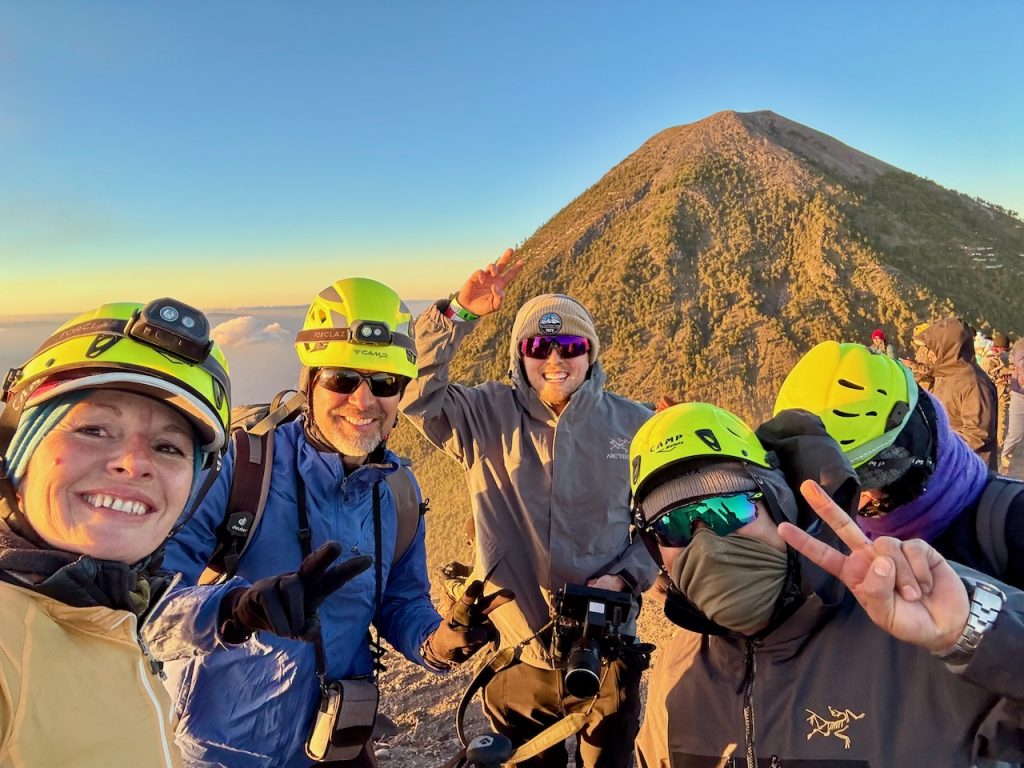 For lunch, we’re served steaks, fried potatoes, sautéed mushrooms and vegetables, along with beer and wine, and it’s simply delicious. After a bit of relaxation, we hike over to Fuego around 4:30 p.m. Funnily enough, we have to go through a rather deep valley, adding another 2,000 feet of elevation gain to the 3,940 feet we’ve already climbed. But we still don’t feel exhausted and soon enjoy the very windy view of the wild Fuego and the volcanic landscape of Guatemala shrouded in clouds. When the sun sets, it’s simply incomparable. On one side of the valley it is already pitch black, on the other still light, and Fuego, with its spewing glowing rocks, is even more dramatic. We are bundled up in five to seven layers of clothing and enjoy the spectacle for over an hour in the strong wind. On the way down, we switch on our headlamps and march single file back to base camp in the dark with several hundred other visitors. Definitely not a pleasant hike, but long and very dusty.