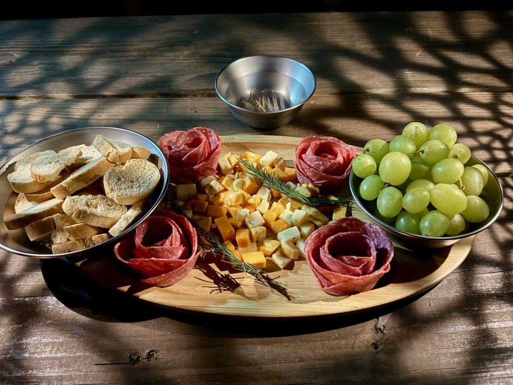 Zurück am Basecamp erwartet uns ein wärmendes Lagerfeuer, eine Käse-Wurst-Weintrauben Platte, und Wein. Wir schauen alle weiter wie gebannt auf den Fuego und bekommen auch noch lecker Pasta mit Pilzsosse direkt am Feuer serviert. Wir sind glücklich, dass wir bei dieser Firma gebucht haben. Irgendwann ziehen wir uns dann ins geheizte Zelt zurück und schlafen ganz OK. Wir beschließen jedoch alle, nicht um 4 Uhr früh für die Gipfelbesteigung des Acatenango aufzustehen, denn dort oben ist es wohl noch windiger, ziemlich ausgesetzt und die Sicht von unserem Basecamp ist schon unübertrefflich.