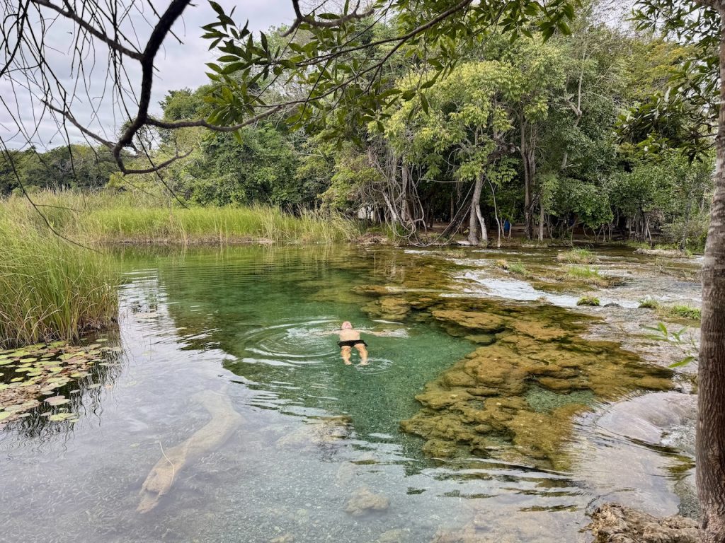 The days in Cristobal Colon are doing us a world of good. The weather is perfect and the area is simply magical. Everything is green and crisscrossed by countless little waterways. The streams, rivers, and lakes are incredibly clear, just like the water in the cenotes. The journey here was initially fine, but things get quite interesting once we’re in the park itself. We explore the area a bit on foot and discover a wonderful grassy clearing beyond a bridge. We chat with a woman, and she says we could easily drive Ewald across – but just before we actually drive on the bridge, we’re stopped by a frantically waving man… he has serious doubts because of Ewald’s weight. So we keep searching and find another bridge leading to an even more beautiful spot. We’re allowed to cross here, but it’s nerve-wracking because there are only a few millimeters of space on either side. CRAZY – but we manage it. We then jump into the crystal-clear river to cool down our overheated bodies and minds. We stay for three days, enjoying the peace and quiet, and on our way out, we discover a different way right through the river. Much better.