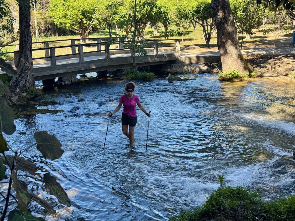 Die Tage in Cristobal Colon tun uns einfach nur gut. Das Wetter ist perfekt und die Gegend einfach nur zauberhaft. Alles ist grün und von vielen kleinen Wasserwegen durchzogen. Die Bäche, Flüsse und Seen sind unglaublich klar, genau wie das Wasser in den Cenoten. Der Weg hierhin war zunächst gut, im Park selbst wird es dann aber ziemlich lustig. Wir erkunden die Gegend etwas zu Fuß und entdecken jenseits einer Brücke einen wundervollen Grasplatz. Wir sprechen mit einer Dame und sie meint wir könnten locker mit Ewald rüberfahren – doch kurz bevor wir tatsächlich fahren werden wir von einem hektisch winkenden Mann aufgehalten … er hat aufgrund des zarten Gewichtes von Ewald doch große Bedenken. Also suchen wir weiter und finden noch eine Brücke, die zu einem noch schöneren Platz führt. Hier dürfen wir rüber aber es ist nervenaufreibend, denn es sind links und rechts nur ein paar Millimeter Platz. IRRE – aber wir schaffen es. Wir springen dann erst mal in den glasklaren Fluß, um unsere erhitzten Körper und Gemüter etwas abzukühlen. Wir bleiben drei Tage und genießen die Ruhe und auf dem Weg raus stellen wir fest, daß es noch einen viel leichteren Weg durch den Fluß gibt. Viel besser.
