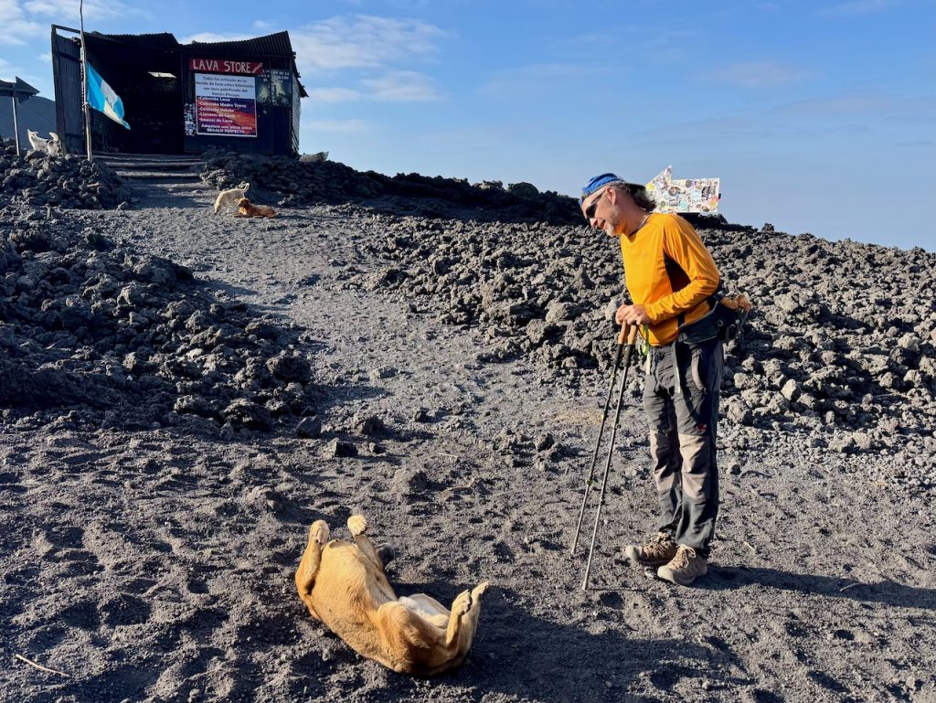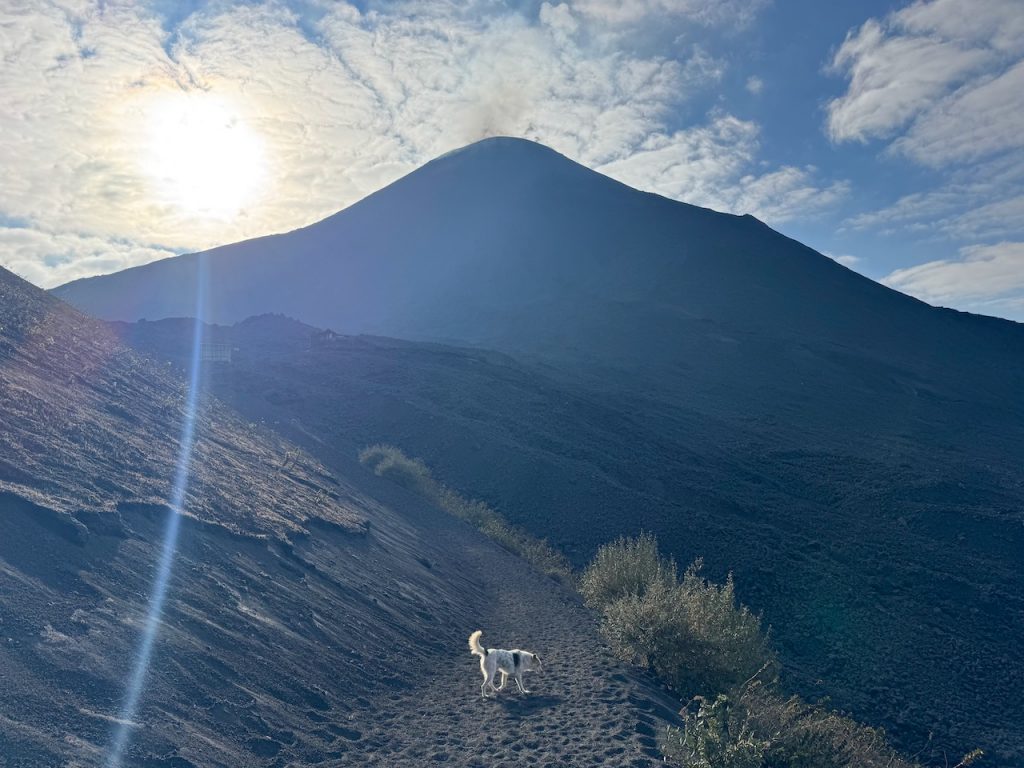 Deysi is ready before 7 a.m., and the three of us, accompanied by five dogs, set off up the mountain. It isn’t very strenuous; we only have to climb about 1,640 feet in altitude, and the hike was only about 3,5 miles long. Deysi tells us a lot about past eruptions and we learn quite a bit about the flora and fauna on the volcano. On a high plateau dotted with steam vents, we roast some marshmallows and enjoy the peace and quiet, as we’re still the only group up here. A beautiful and informative, if not spectacular, hike. We especially enjoy the steep descent through an ash field. Here we can run down through the soft lava sand, which feels like skiing.