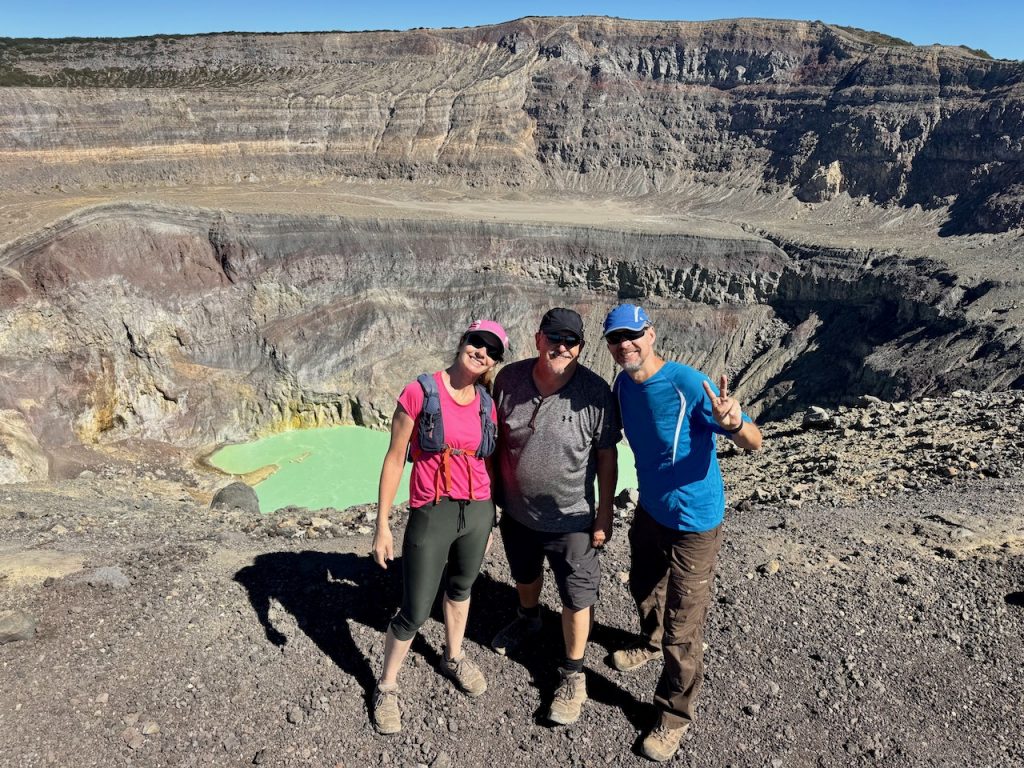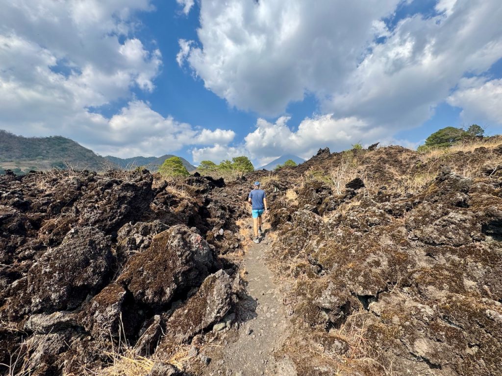 The next morning, we get up early and go with Neil to the meeting point for Cerro Verde National Park. Unfortunately, it seems that hiking without a guide is not permitted in many areas of El Salvador, so we have to find a guide first. There was some initial confusion, as most visitors arrive „organized“ with tour operators, but a few phone calls later, the solution is found in the form of Estepan. We decide to „book“ him as a private guide and soon after we begin our ascent of the volcano. After 1.5 hours, we are at the crater at 2,300 meters and enjoy the stunning views. The sulfurous smell of the crater lake almost knocks us off our feet, so we walk along the crater for a while and are simply speechless at the lake’s color. It looks deadly toxic and bubbles merrily away at 45 degrees Celsius. It doesn’t exactly invite us to swim. The nearby Lago de Coatepeque, at least from a distance, looks much more inviting. After 3 hours, we’re back at Pat, Ewald, and Cloud 9, enjoying our second breakfast. We’re really glad we set off so early, because shortly after we started our descent, we encountered huge groups coming towards us.