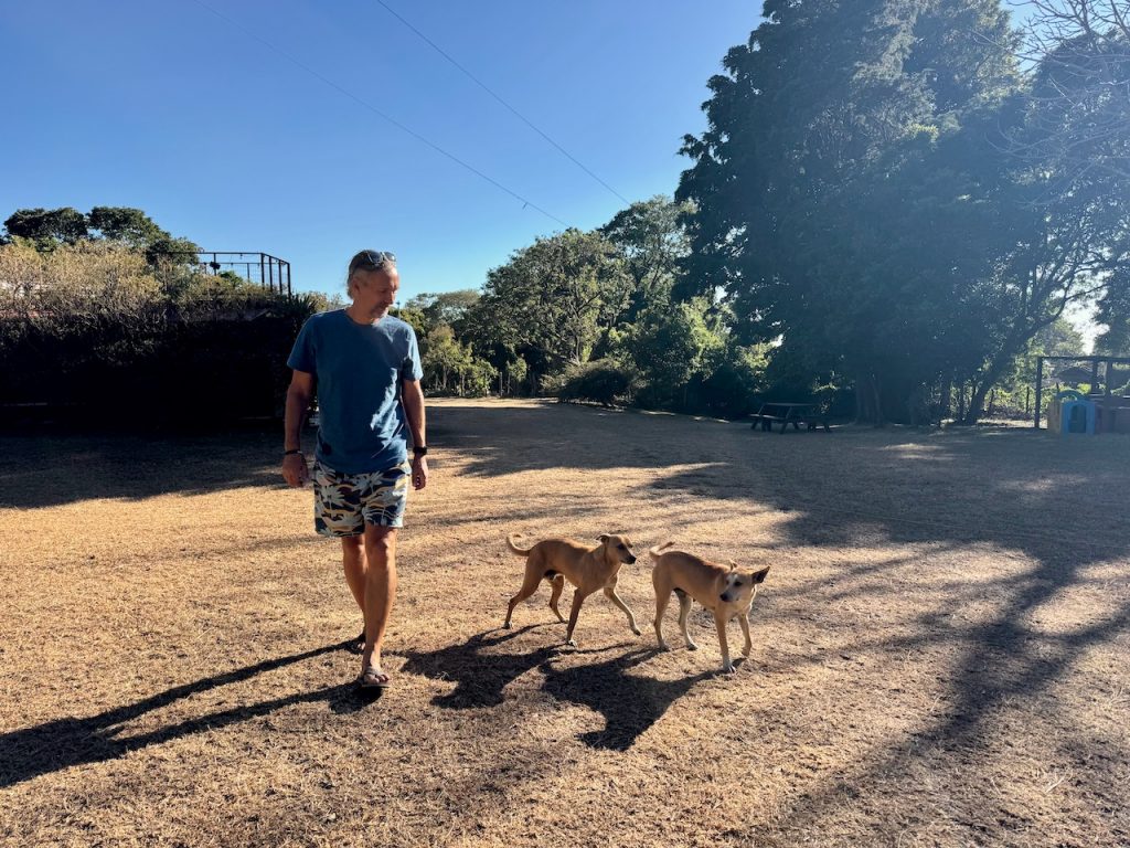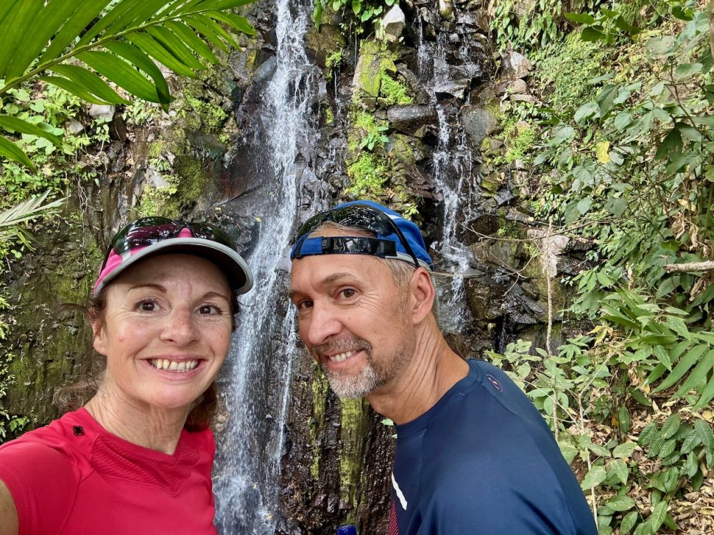 But the effort is worth it; we arrive at Finca La Escondida – the hidden finca. We have a view of four volcanoes: Pacaya, Agua, Acatenango, and Fuego, and it is wonderfully peaceful and beautiful. The vast, almost deserted finca is dotted with small works of art, viewpoints, and swings, and we are surrounded by cows, horses, and cattle egrets. Simply idyllic. From here we can also go for great runs and hikes, and so we are enjoying a few very peaceful days here. Pacaya is much more beautiful to look at from here. We hike to a waterfall – at first we think it’s probably dried up or that we won’t find it at all. But after almost 4 miles, partly through lava fields, we find it and it’s even still flowing with water. Yippee!