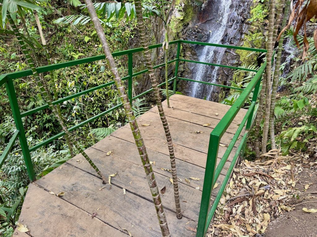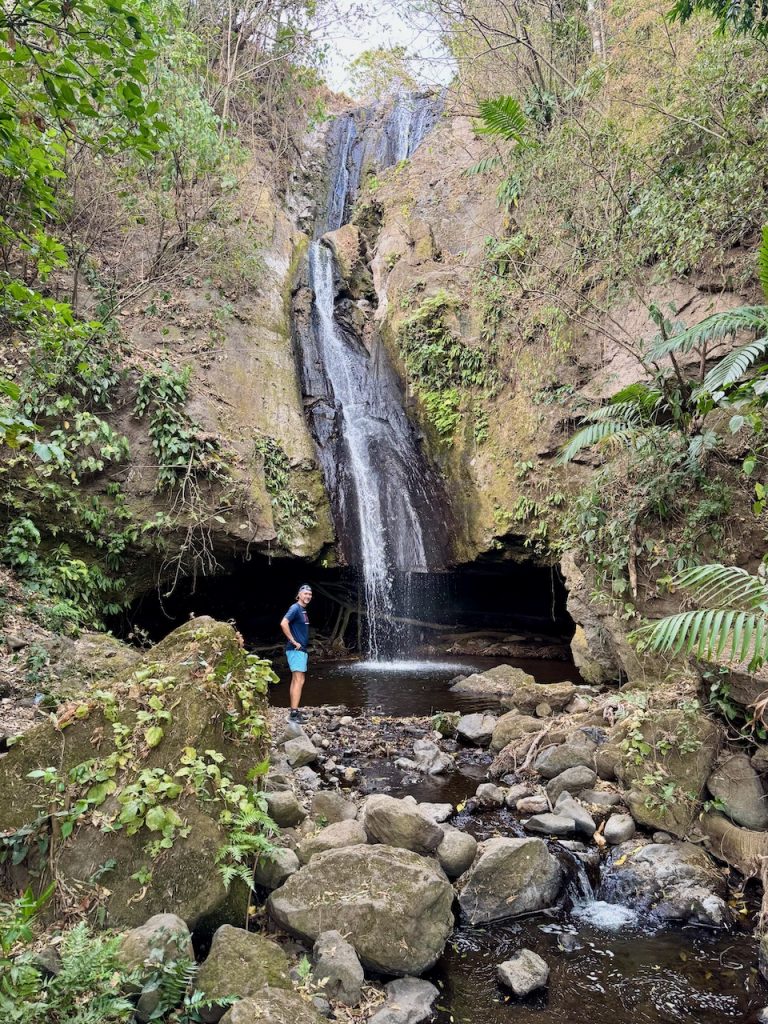 Doch die Mühe hat sich gelohnt, wir landen auf der Finca La Escondida – die versteckte Finca. Wir haben die vier Vulkane, Pacaya, Agua, Acatenango und Fuego im Blick und es ist herrlich ruhig und wunderschön hier. Die riesige fast menschenleere Finca ist gesprenkelt mit kleinen Kunstwerken, Miradoren, Schaukeln und wir sind umgeben von Kühen, Pferden und Kuhreihern. Einfach idyllisch. Von hier aus können wir auch prima laufen und wandern und so genießen wir hier ein paar sehr ruhige Tage. Von hier aus ist auch der Pacaya viel schöner anzuschauen. Wir unternehmen eine Wanderung zu einem Wasserfall – zunächst denken wir, dass er vermutlich ausgetrocknet ist oder dass wir ihn gar nicht finden. Doch nach knapp 6 km, teilweise durch Lavafelder finden wir ihn und er führt sogar noch jede Menge Wasser. Yippie.
