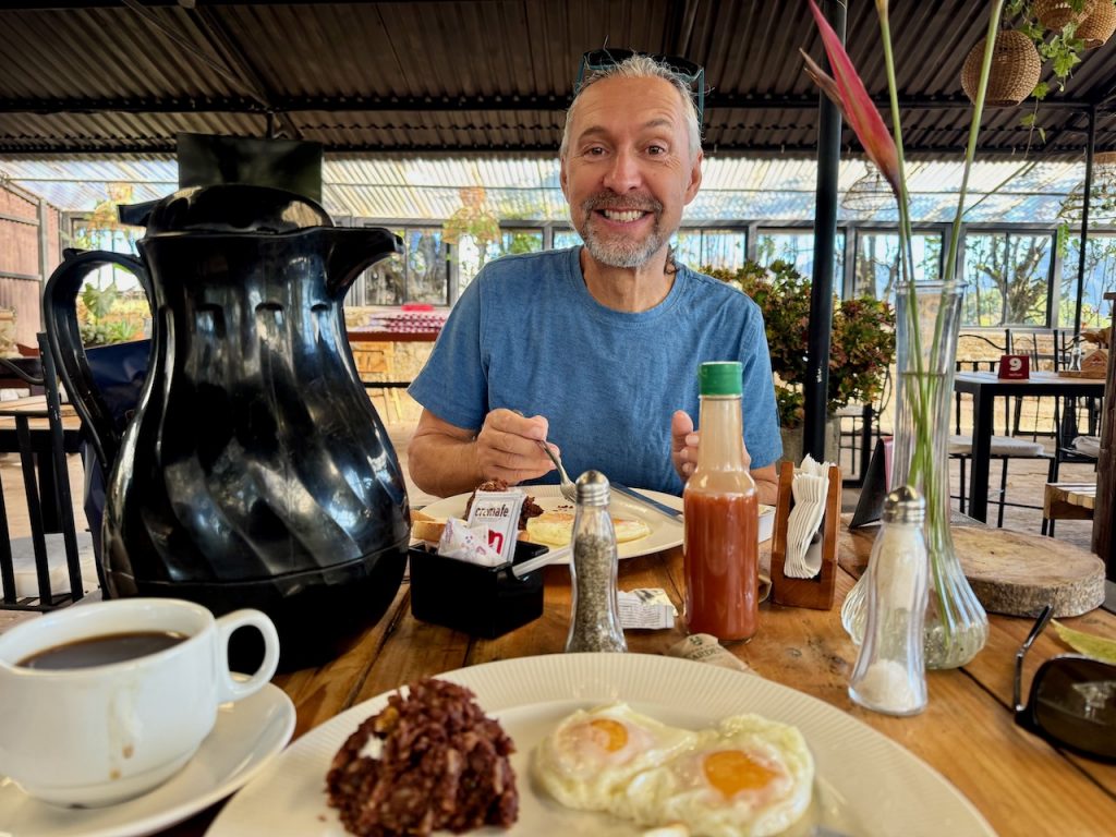 The night at the finca is wonderfully peaceful, and the next morning we’re treated to a delicious breakfast followed by a comprehensive tour of the entire estate. The coffee is processed differently here than in Guatemala. Here, the whole cherries are first dried for 15 days in large open fields, and then the fruit is separated from the beans, which are then washed and dried again. In Guatemala, the pulp was separated directly from the beans (without drying). The second drying process takes another five days, during which the beans are constantly turned by hand. In general, there’s a great deal of manual labor involved, sorting takes place multiple times before and after roasting. The beans are also sorted by size, but this is done using roughly 130-year-old vibrating machines. We learn a lot and are happy to understand almost everything in Spanish, even though our guide speaks incredibly fast Spanish. Of course, we also buy coffee, because it tasted really delicious at breakfast.