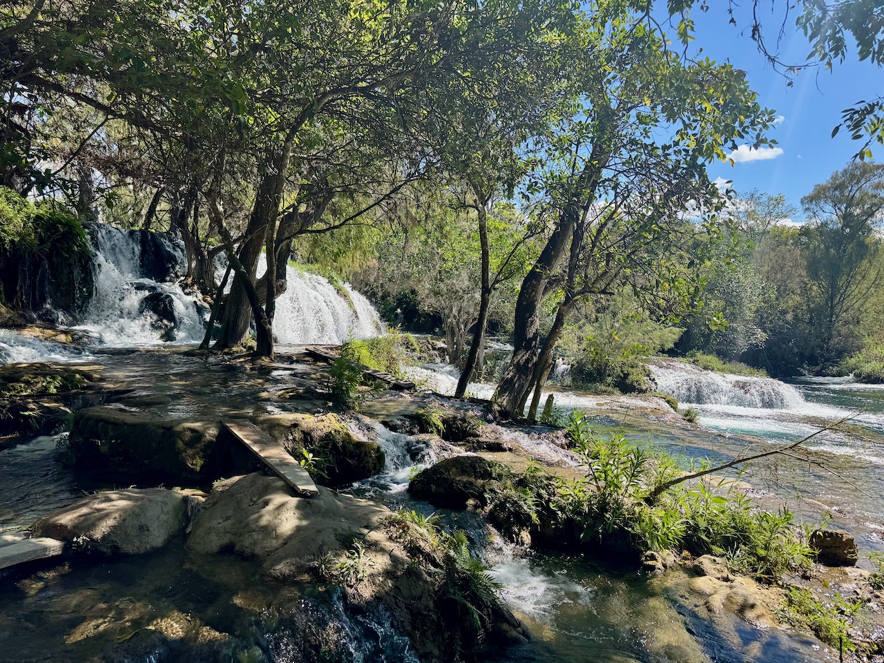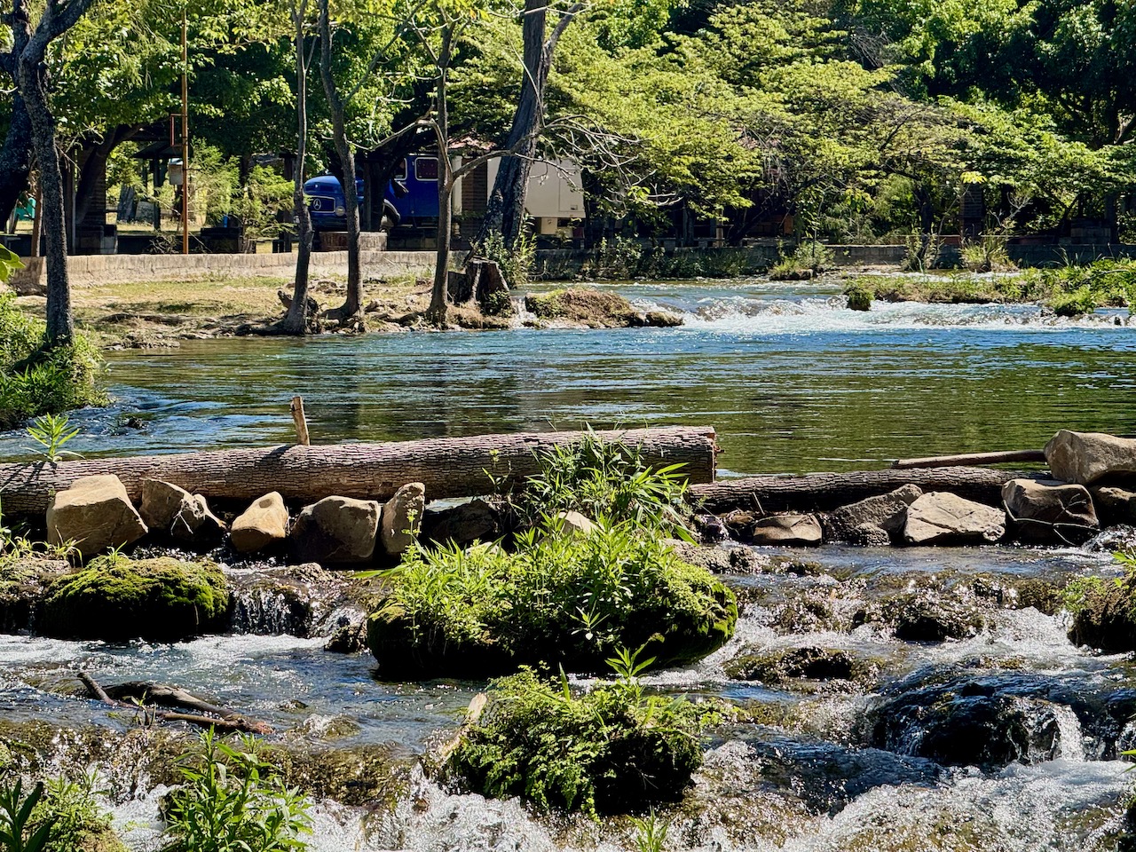The days in Cristobal Colon are doing us a world of good. The weather is perfect and the area is simply magical. Everything is green and crisscrossed by countless little waterways. The streams, rivers, and lakes are incredibly clear, just like the water in the cenotes. The journey here was initially fine, but things get quite interesting once we’re in the park itself. We explore the area a bit on foot and discover a wonderful grassy clearing beyond a bridge. We chat with a woman, and she says we could easily drive Ewald across – but just before we actually drive on the bridge, we’re stopped by a frantically waving man… he has serious doubts because of Ewald’s weight. So we keep searching and find another bridge leading to an even more beautiful spot. We’re allowed to cross here, but it’s nerve-wracking because there are only a few millimeters of space on either side. CRAZY – but we manage it. We then jump into the crystal-clear river to cool down our overheated bodies and minds. We stay for three days, enjoying the peace and quiet, and on our way out, we discover a different way right through the river. Much better.