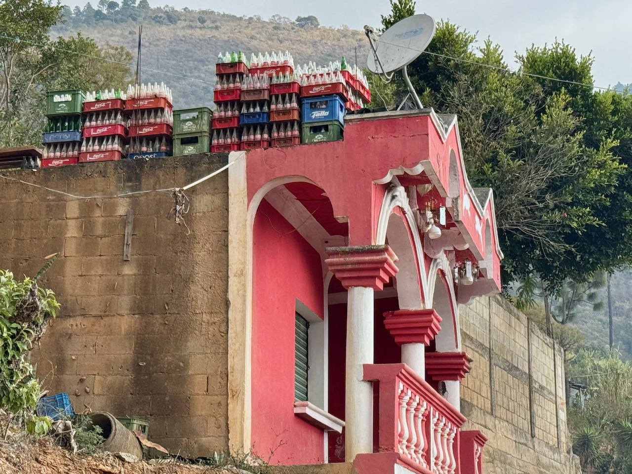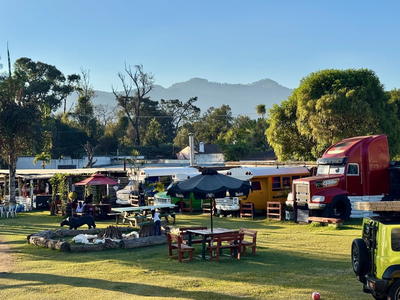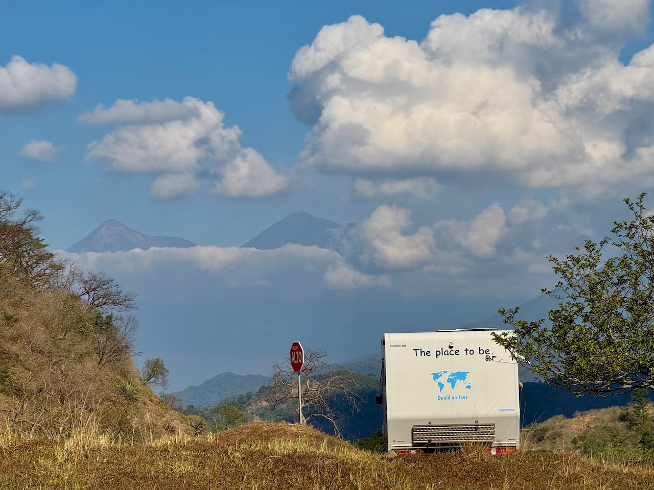 A few days later, we drive down into lower-lying regions again, stopping overnight at „our“ Mirador viewpoint. Unfortunately, we have to go through Huehue again—but this time, although the journey is slow, it’s relatively relaxed. We spent the night behind a gas station, well-guarded by a rifle-wielding „deputy sheriff,“ and after a surprisingly quiet night there, we continue our journey on a fantastic road (CA-1) towards Antigua. Along the way, we find a lovely restaurant with delicious frapucchinos and crepes. We ask if we can stay overnight—and of course, they say yes. Everyone is so warm, helpful, and kind to us. We are simply spoiled.