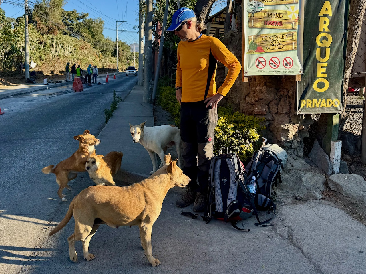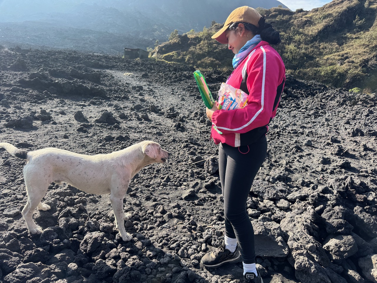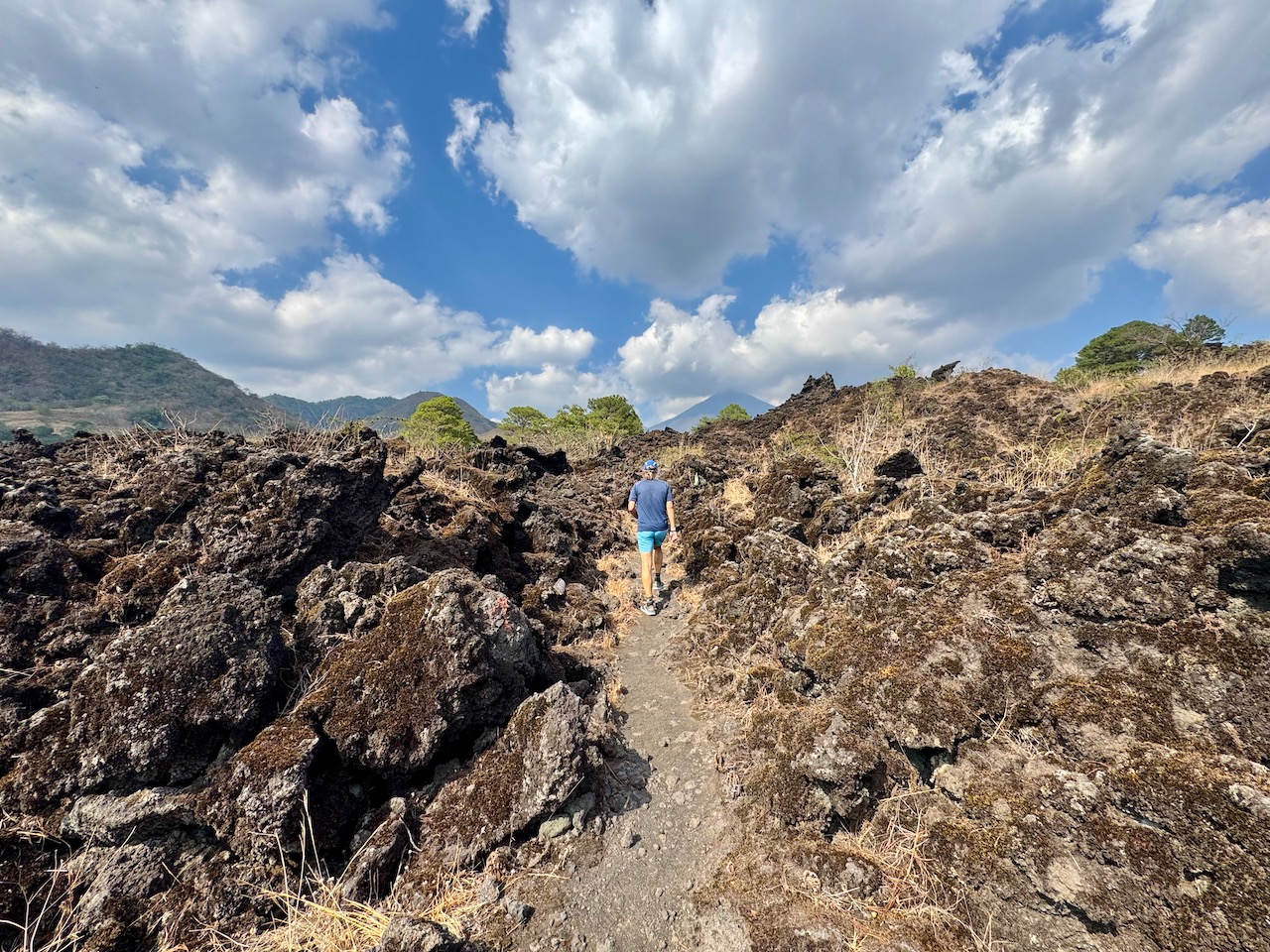 Deysi is ready before 7 a.m., and the three of us, accompanied by five dogs, set off up the mountain. It isn’t very strenuous; we only have to climb about 1,640 feet in altitude, and the hike was only about 3,5 miles long. Deysi tells us a lot about past eruptions and we learn quite a bit about the flora and fauna on the volcano. On a high plateau dotted with steam vents, we roast some marshmallows and enjoy the peace and quiet, as we’re still the only group up here. A beautiful and informative, if not spectacular, hike. We especially enjoy the steep descent through an ash field. Here we can run down through the soft lava sand, which feels like skiing.
