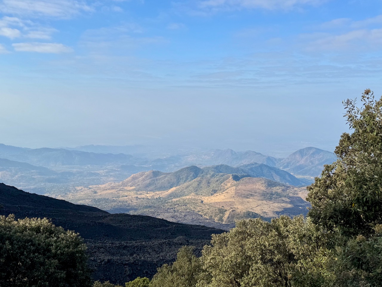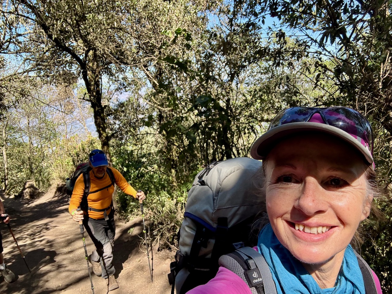 The beginning is awful, a steep climb on a narrow, dusty path between barbed wire fences. We encounter a lot of hikers coming down from above, which isn’t much fun. After about 1 mile, we reach the forest, and from then on, we don’t see as many hikers coming the other way. So, the four of us spend the next 4 miles (to base camp) on the mostly steep and quite challenging trail. However, we feel strong and full of energy the whole time—unlike Dylan, who’s simply carrying too much gear. Our fantastic guide, Hibierto, relieves him early on, and so Dylan, who soon adopts us, makes it up without any problems. He’s been commissioned to film a new promotional video for our tour operator—something we’re also looking forward to, as we’ll likely be quite visible.