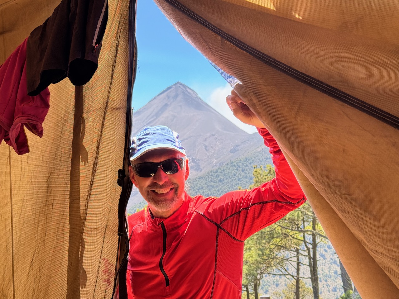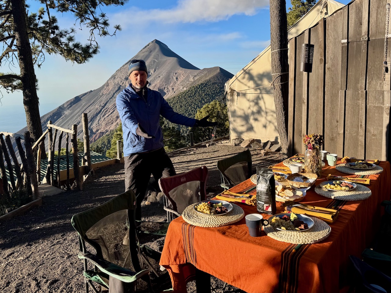 After just under 3.5 hours, we arrive at base camp and immediately enjoy a cold beer with a magnificent view. It’s still very quiet on Acatenango, as most of the groups don’t start their ascent until two hours later and usually take longer. Our camp at 11,820 feet is absolutely wonderful and comfortable, with a fantastic view of Fuego. The active volcanic crater is now only about 1.4 miles away as the crow flies. Hibierto is preparing lunch, and after about an hour, three more guests arrive, having been driven up in a 4×4. Now there are six of us, and we all get along fantastically right away and have a great time together.