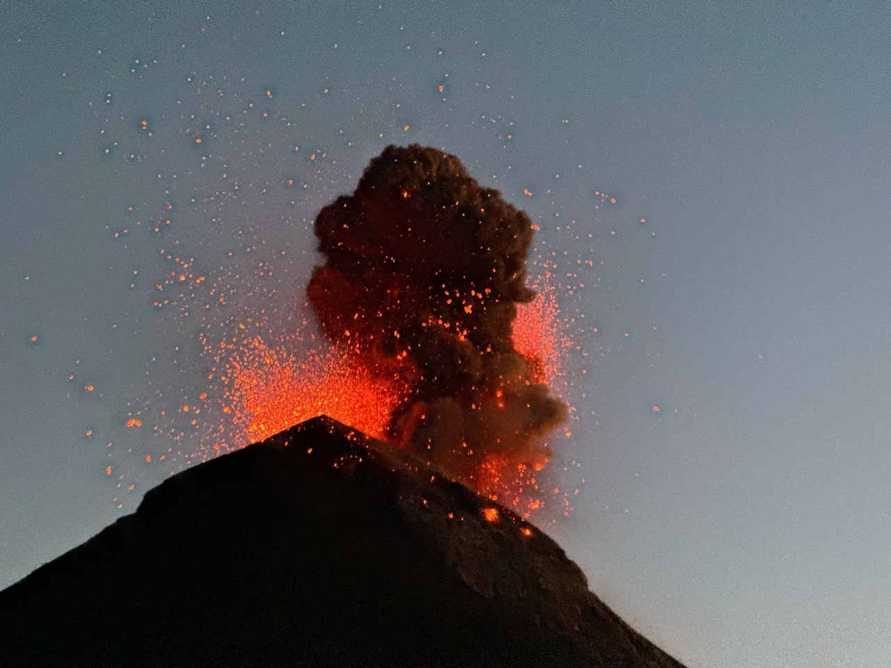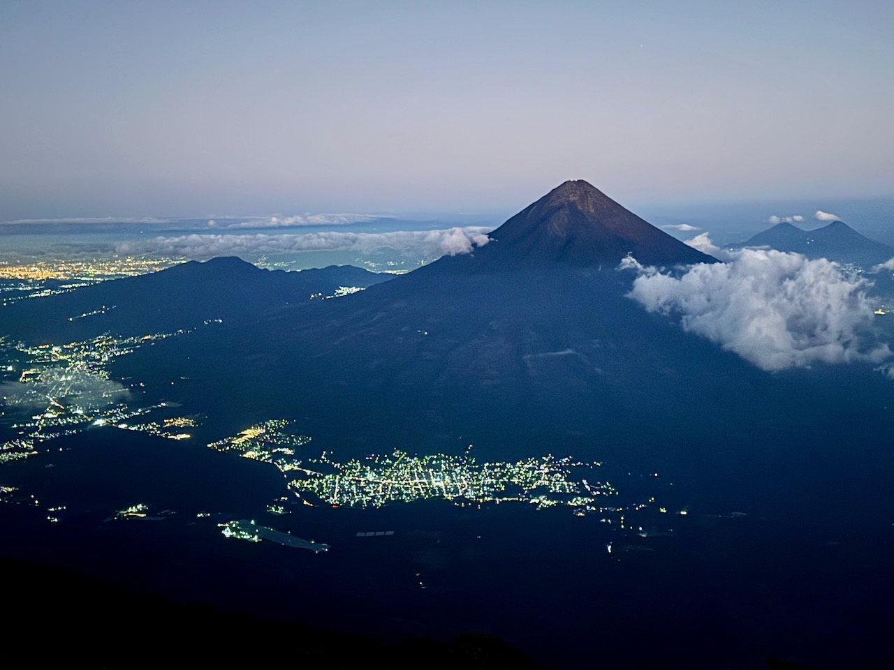 For lunch, we’re served steaks, fried potatoes, sautéed mushrooms and vegetables, along with beer and wine, and it’s simply delicious. After a bit of relaxation, we hike over to Fuego around 4:30 p.m. Funnily enough, we have to go through a rather deep valley, adding another 2,000 feet of elevation gain to the 3,940 feet we’ve already climbed. But we still don’t feel exhausted and soon enjoy the very windy view of the wild Fuego and the volcanic landscape of Guatemala shrouded in clouds. When the sun sets, it’s simply incomparable. On one side of the valley it is already pitch black, on the other still light, and Fuego, with its spewing glowing rocks, is even more dramatic. We are bundled up in five to seven layers of clothing and enjoy the spectacle for over an hour in the strong wind. On the way down, we switch on our headlamps and march single file back to base camp in the dark with several hundred other visitors. Definitely not a pleasant hike, but long and very dusty.