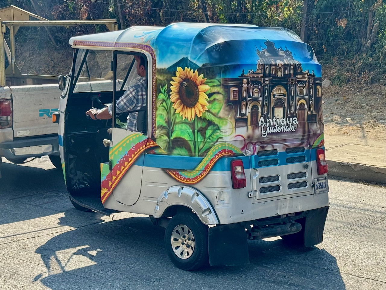 Ein paar Tage später fahren wir wieder mit einer Zwischenübernachtung an „unserem“ Mirador in tiefere Regionen. Unglücklicherweise müssen wir wieder durch Huehue – doch es läuft diesmal zwar langsam aber relativ entspannt. Wir übernachten, gut bewacht von einem mit Gewehr ausgerüsteten „Hilfssheriff“ hinter einer Tankstelle und nach einer erstaunlich ruhigen Nacht dort fahren wir weiter auf einer fantastischen Straße (CA-1) Richtung Antigua. Auf dem Weg finden wir ein goldiges Restaurant mit leckeren Frapuchinos und Crepes. Wir fragen, ob wir dort auch übernachten dürfen – und natürlich dürfen wir. Alle sind so herzlich, hilfsbereit und lieb zu uns. Wir werden einfach verwöhnt.