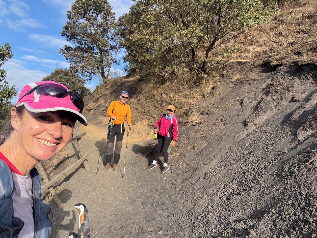 Deysi ist schon vor 7 Uhr bereit und wir marschieren zu Dritt, begleitet von 5 Hunden, den Berg hinauf. Es ist nicht sehr anstrengend, wir haben nur gute 500 Höhenmeter zu bewältigen und die Wanderung ist auch nur gute 5 km lang. Doch erfahren wir von Deysi viel von den vergangenen Ausbrüchen und lernen einiges über die Pflanzen- und Tierwelt auf dem Vulkan. Auf einem Hochplateau mit vielen Dampfschloten brutzeln wir uns ein paar Marshmellows und genießen die Stille, denn noch sind wir die einzige Truppe hier oben. Eine schöne und informative, wenn auch nicht spektakuläre Wanderung. Uns hat besonders der steile Abstieg durch ein Aschefeld Spaß gemacht. Hier konnten wir durch den weichen Lavasand herunterlaufen, was sich wie Skifahren angefühlt hat.