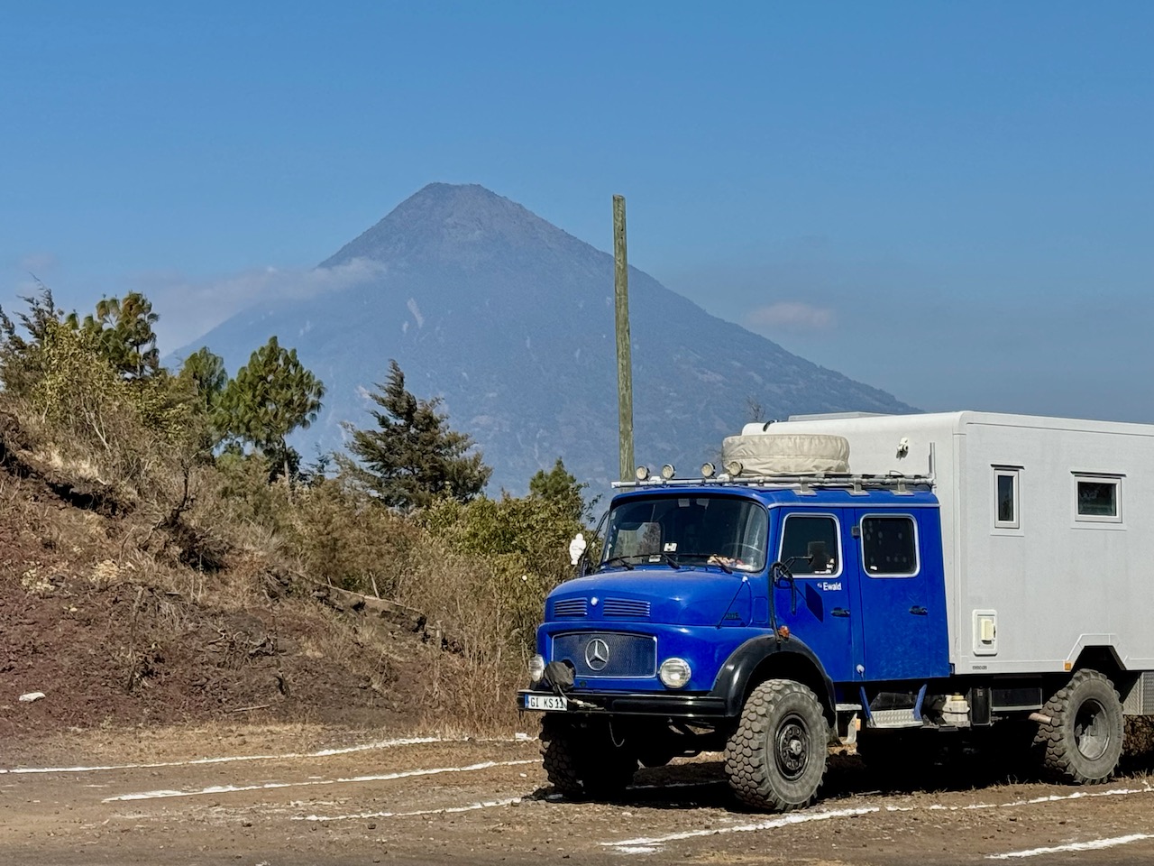 Nach 9 Nächten in Antigua schaffen wir es, sehr schweren Herzens, Antigua hinter uns zu lassen. Wir fahren 35 km durch kleinste Bergdörfchen mit super engen Gässchen (Ewald dürfte noch nicht mal 2 mm breiter oder länger sein) und kommen nach etwa 2 Stunden am Parkplatz des Vulkan Pacaya an. Hier sind, wie fast immer in Guatemala, super hilfsbereite und liebe Menschen und wir verabreden uns, den Pacaya am nächsten Tag um 7 Uhr mit einem Führer zu besteigen. Pacaya ist Guatemalas dritter aktiver Vulkan, jedoch pustet er zur Zeit nur Dampf aus dem Hauptkrater und vielen kleinen Seitenkratern. Diesen Vulkan kann man sicherlich auch ungeführt besteigen, doch unterstützen wir gerne die lokale Wirtschaft und freuen uns, spanisch zu sprechen und mehr zu erfahren.