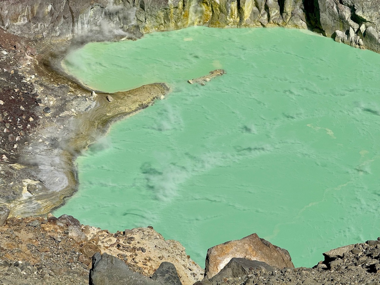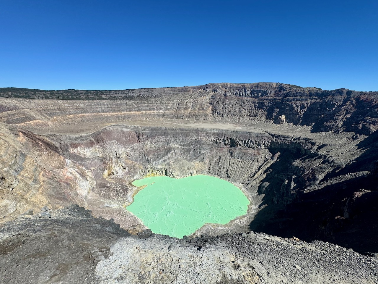 The next morning, we get up early and go with Neil to the meeting point for Cerro Verde National Park. Unfortunately, it seems that hiking without a guide is not permitted in many areas of El Salvador, so we have to find a guide first. There was some initial confusion, as most visitors arrive „organized“ with tour operators, but a few phone calls later, the solution is found in the form of Estepan. We decide to „book“ him as a private guide and soon after we begin our ascent of the volcano. After 1.5 hours, we are at the crater at 2,300 meters and enjoy the stunning views. The sulfurous smell of the crater lake almost knocks us off our feet, so we walk along the crater for a while and are simply speechless at the lake’s color. It looks deadly toxic and bubbles merrily away at 45 degrees Celsius. It doesn’t exactly invite us to swim. The nearby Lago de Coatepeque, at least from a distance, looks much more inviting. After 3 hours, we’re back at Pat, Ewald, and Cloud 9, enjoying our second breakfast. We’re really glad we set off so early, because shortly after we started our descent, we encountered huge groups coming towards us.