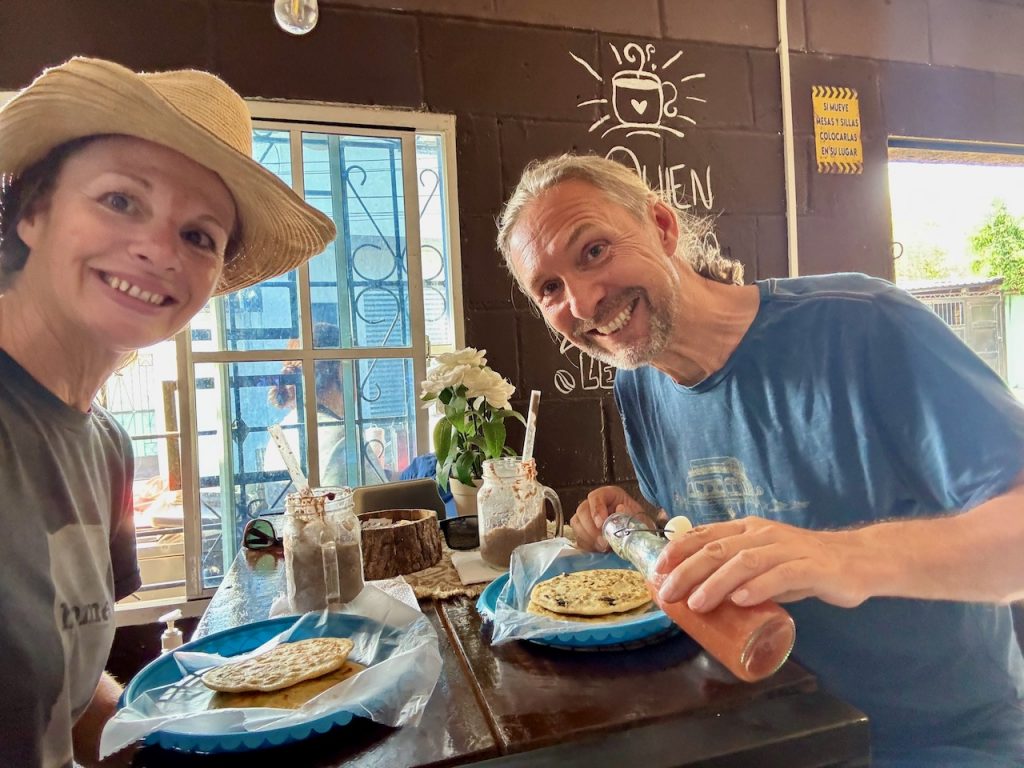 We continue on to Sacacoyo and meet up with Pat and Neil again at a beautiful finca. Elli and her husband have created a little paradise for travelers here, with a beautiful patio overlooking the hot valley. At 650 meters above sea level, there’s always a breeze, making it quite pleasant. We’re allowed to use the washing machine, and Luna, the three-month-old „pied piper,“ is always around. Thanks to Neil’s jack, we even manage to turn the wheels. After half a day, and without a single curse, it’s done. Incredible! We spend a few relaxing days at the finca and also enjoy the little village. Here we eat our first pupusas… the national dish of El Salvador. They’re pastries, usually made from a mixture of corn and rice flour, filled with cheese and all sorts of other ingredients, fried, and served with salsa and coleslaw. Delicious! Our favorite pupusas are the ones with spinach and garlic, but all the others are extremely tasty and filling.