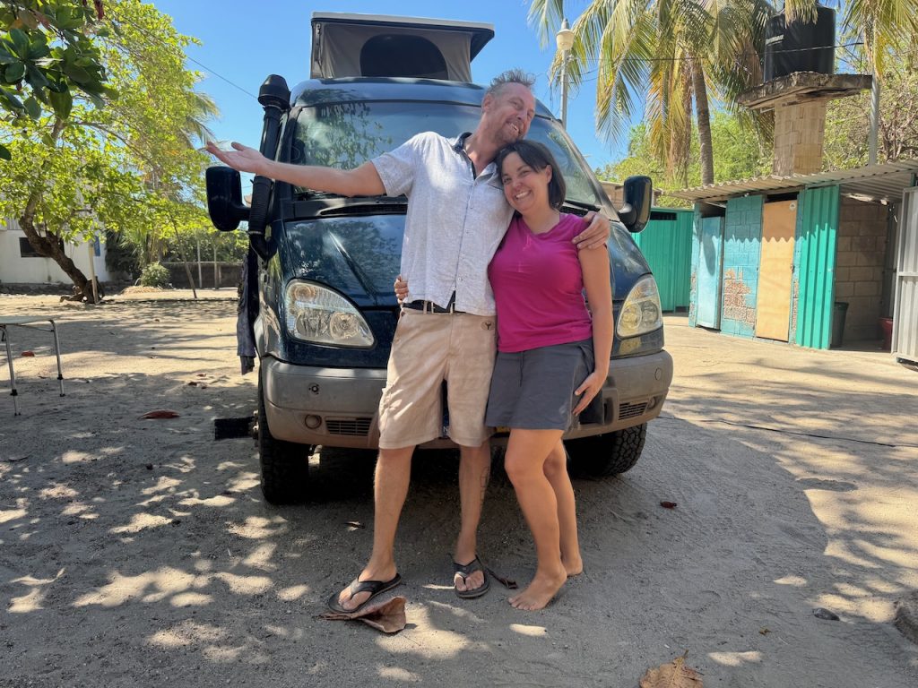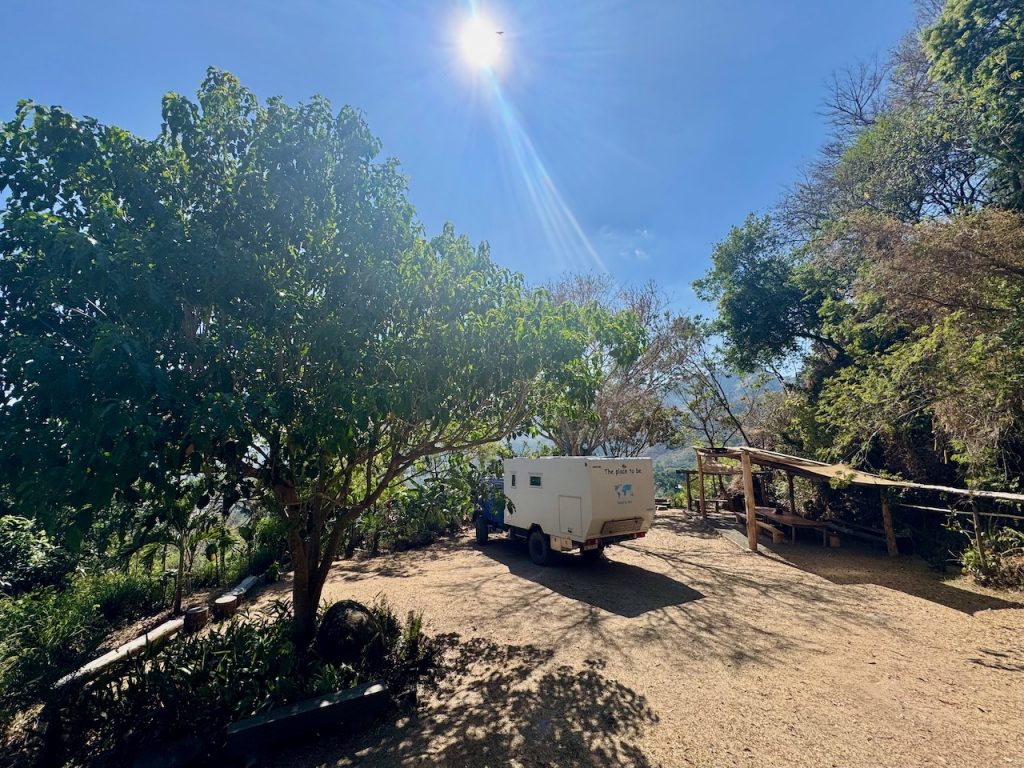 We’re reluctant to leave Berlin, as we now have to head back down to the lowlands. In San Miguel, we do some shopping and stock up on groceries – it’s so hot! – and then spontaneously decide to drive to the beach. After about 40 km, we arrive at a small bay near Playa El Cuco, where we can plunge into the Pacific waves. Wonderful! We stand under palm trees and other trees, and with a pleasant breeze, it’s more than comfortable. We also meet Tycha and Stephen here. The two of them travel for three months every year in their Russian „Gazelle“ campervan. Very cool, and we have a great time together.