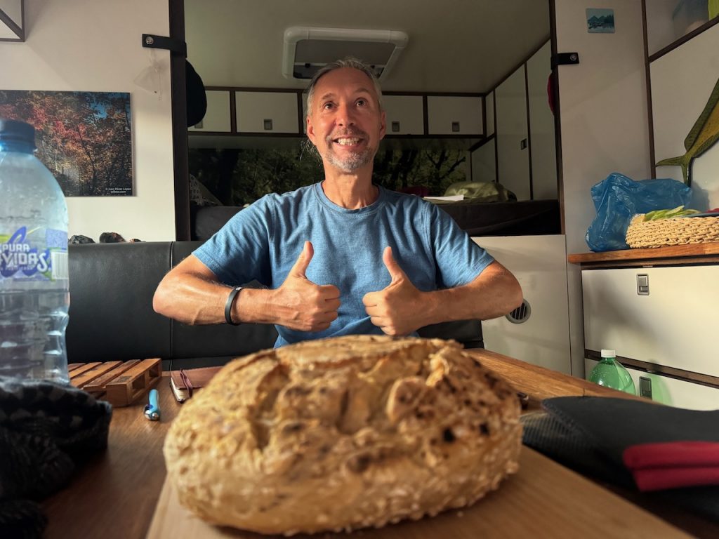We’re spending a few more incredibly peaceful nights near the Santa Ana volcano. We actually thought it would be quite busy over the weekend, but on Friday evening it was completely silent, and we felt like we were the only people in the entire area. Amazing. Twice in the morning we hiked up to the Mirador, exactly 4 kilometers up the mountain, and admired the slightly steaming Volcán de Izalco from above. Then we wanted to rotate the wheels – we were parked on the grass, which was pretty level, and thought it would be a good opportunity. But with only one jack and, admittedly, a lot of wood, the whole thing proved rather awkward and wobbly. So we postponed it.