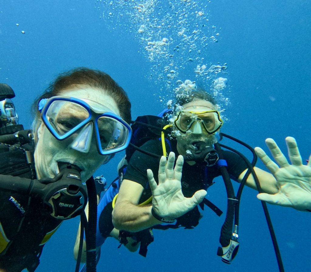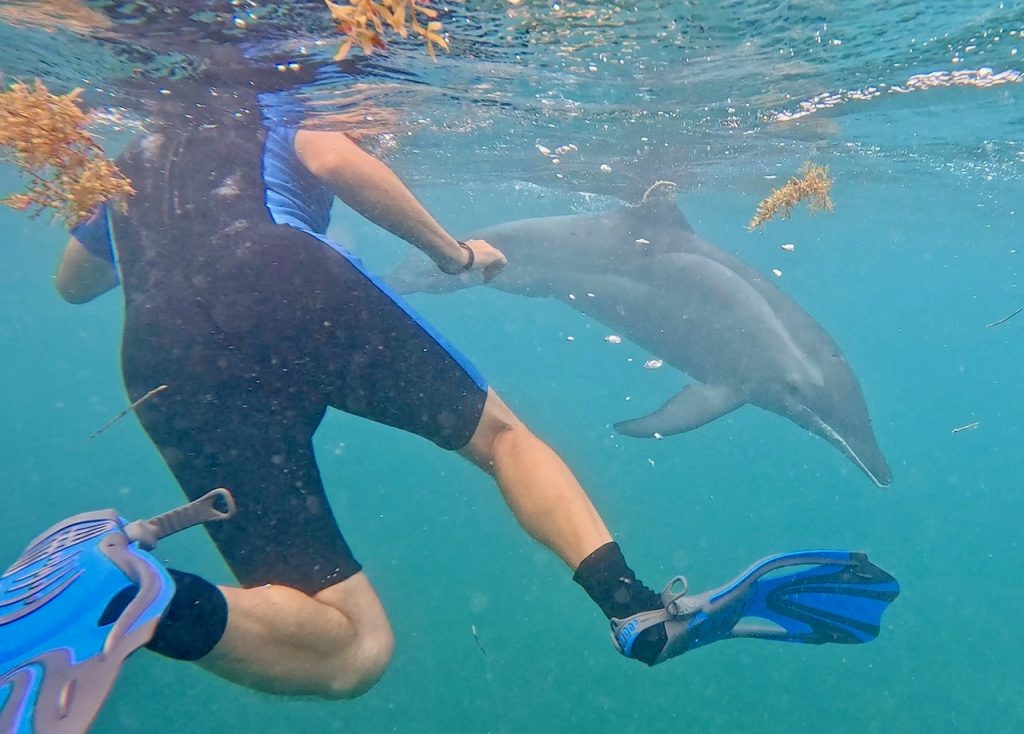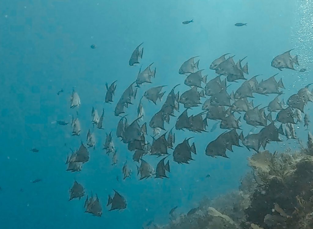 Das Tauchen begeistert uns zunächst nicht so sehr. Natürlich sind die Unterwasser Landschaften fantastisch und die Sicht ist schon einmalig. Doch fragen wir uns, wo die ganzen Fische sind. Wir sind vermutlich einfach zu verwöhnt. Doch am zweiten Tauchtag wird es deutlich besser, es fängt schon damit an, dass wir mit Rauzahn Delfinen schnorcheln. Sie kommen hautnah an uns ran und bleiben sehr lange in unserer Nähe. Einfach ein großartiges Erlebnis. Und die Tauchgänge sind dann auch sehr schön mit tanzenden Adlerrochen und vielen anderen schönen Sichtungen. Also revidieren wir unsere Meinung. Das Tauchen ist doch schön hier – auch wenn wir den einen oder anderen etwas langweiligeren Tauchgang hatten.