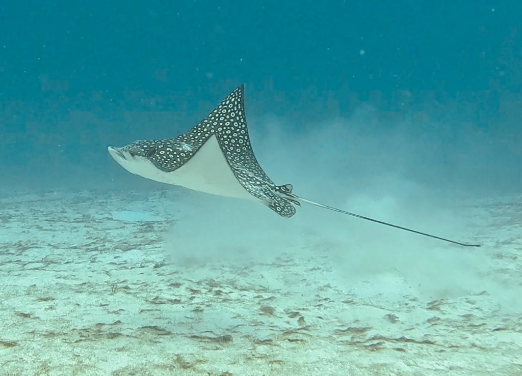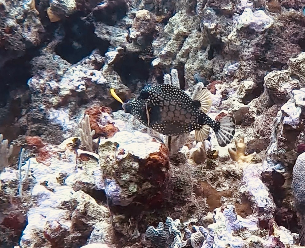 The diving doesn’t initially impress us that much. Of course, the underwater landscapes are fantastic, and the visibility is truly exceptional. But we wonder where all the fish are. We’re probably just too spoiled. However, things improve significantly on the second day of diving, starting with snorkeling with rough-toothed dolphins. They come right up to us and stay close for a very long time. Simply a fantastic experience. And the dives are also very beautiful, with dancing eagle rays and many other wonderful sightings. So we revised our opinion. The diving here is indeed beautiful – even if we had one or two slightly less exciting dives.
