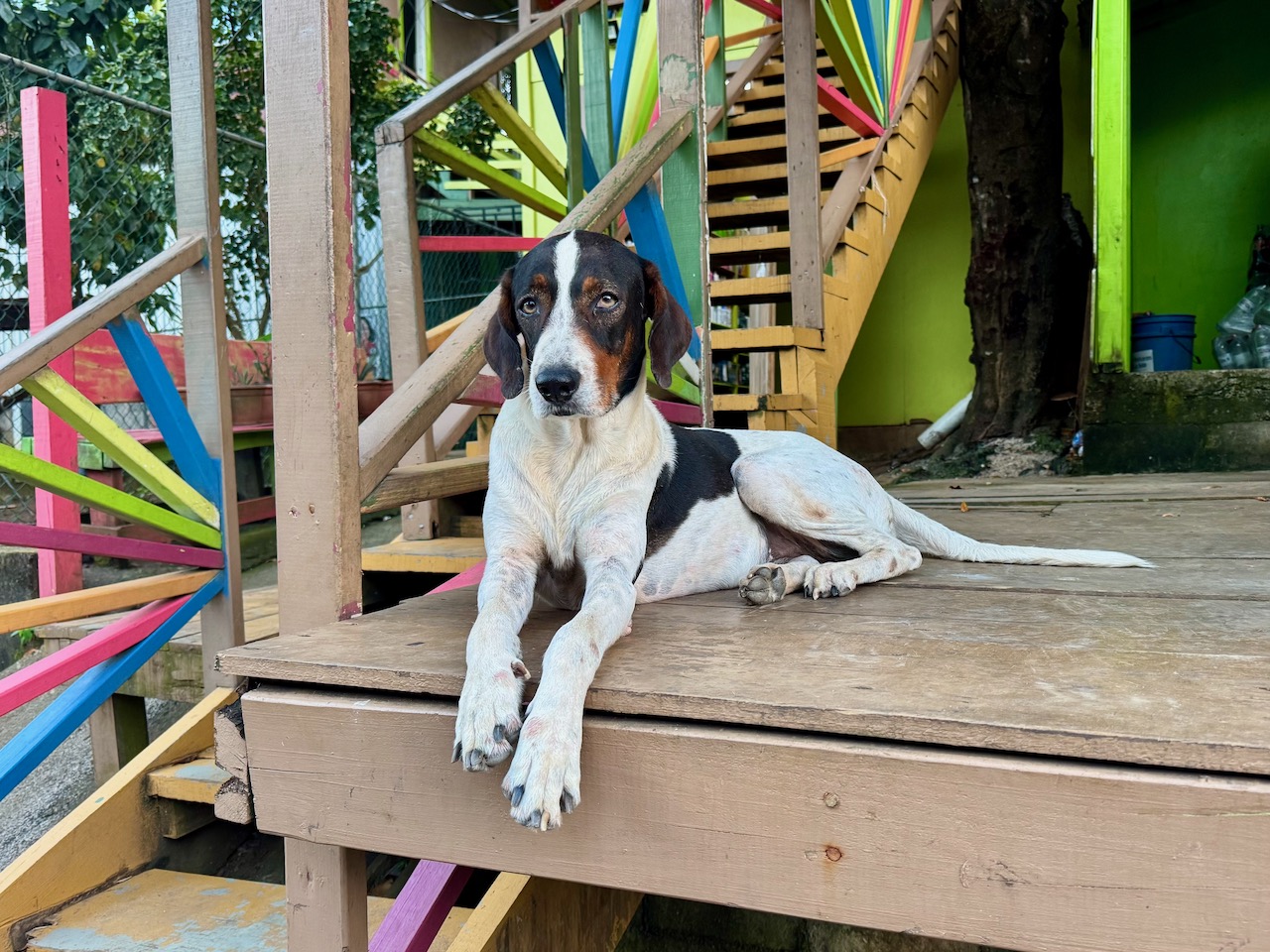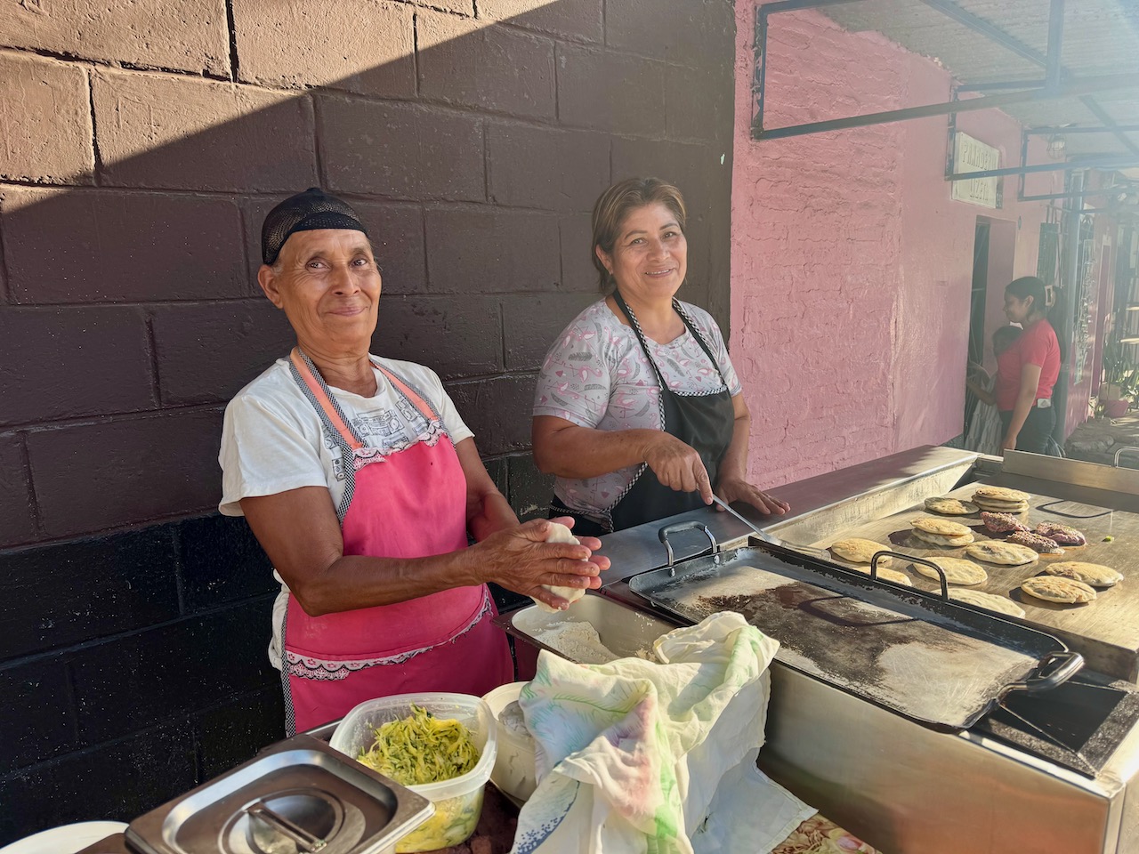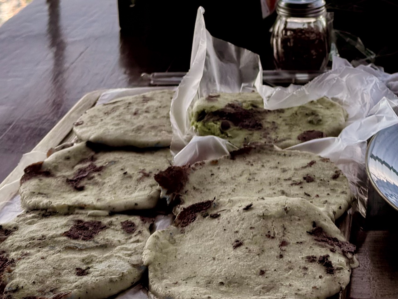 We continue on to Sacacoyo and meet up with Pat and Neil again at a beautiful finca. Elli and her husband have created a little paradise for travelers here, with a beautiful patio overlooking the hot valley. At 650 meters above sea level, there’s always a breeze, making it quite pleasant. We’re allowed to use the washing machine, and Luna, the three-month-old „pied piper,“ is always around. Thanks to Neil’s jack, we even manage to turn the wheels. After half a day, and without a single curse, it’s done. Incredible! We spend a few relaxing days at the finca and also enjoy the little village. Here we eat our first pupusas… the national dish of El Salvador. They’re pastries, usually made from a mixture of corn and rice flour, filled with cheese and all sorts of other ingredients, fried, and served with salsa and coleslaw. Delicious! Our favorite pupusas are the ones with spinach and garlic, but all the others are extremely tasty and filling.
