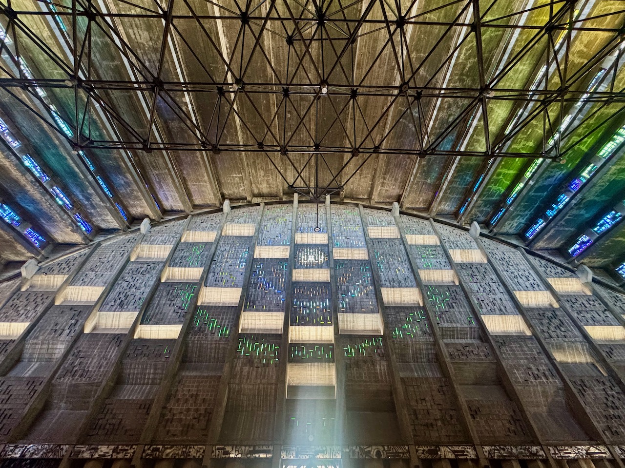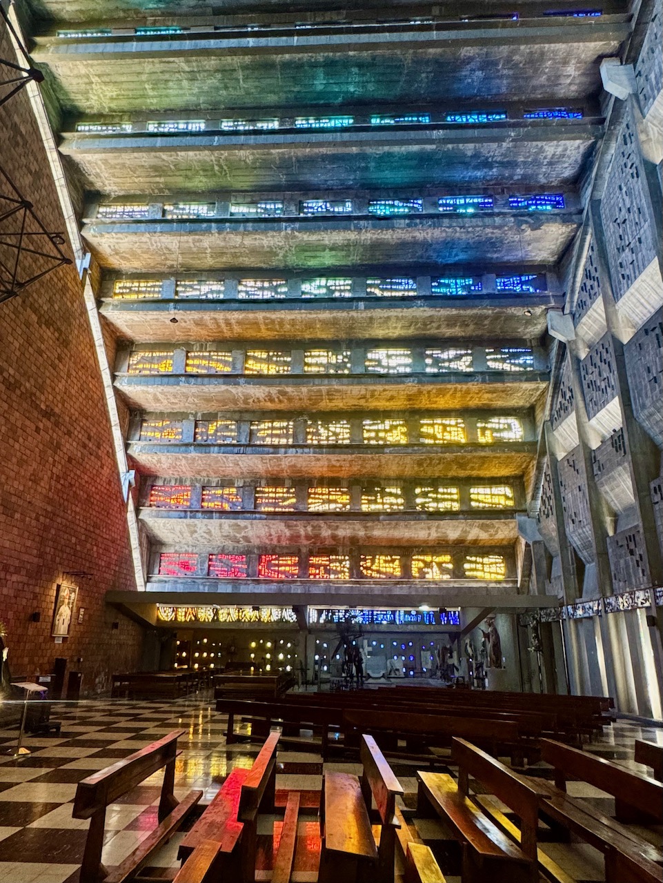 Another special experience awaits us at the Iglesia El Rosario—yes, yet another church. It was completed in 1971, and Ruben Martinez created an architectural gem here. From the outside, it looks like a semicircular concrete bunker, but inside it’s simply incredible. The building is oriented north-south, allowing sunlight to stream in through the hundreds of stained-glass windows all day long. We feel like we’re inside a rainbow. Definitely worth a visit.