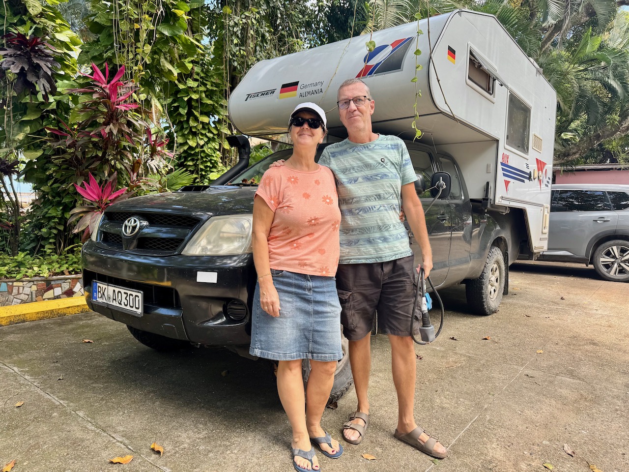 We’re reluctant to leave Berlin, as we now have to head back down to the lowlands. In San Miguel, we do some shopping and stock up on groceries – it’s so hot! – and then spontaneously decide to drive to the beach. After about 40 km, we arrive at a small bay near Playa El Cuco, where we can plunge into the Pacific waves. Wonderful! We stand under palm trees and other trees, and with a pleasant breeze, it’s more than comfortable. We also meet Tycha and Stephen here. The two of them travel for three months every year in their Russian „Gazelle“ campervan. Very cool, and we have a great time together.