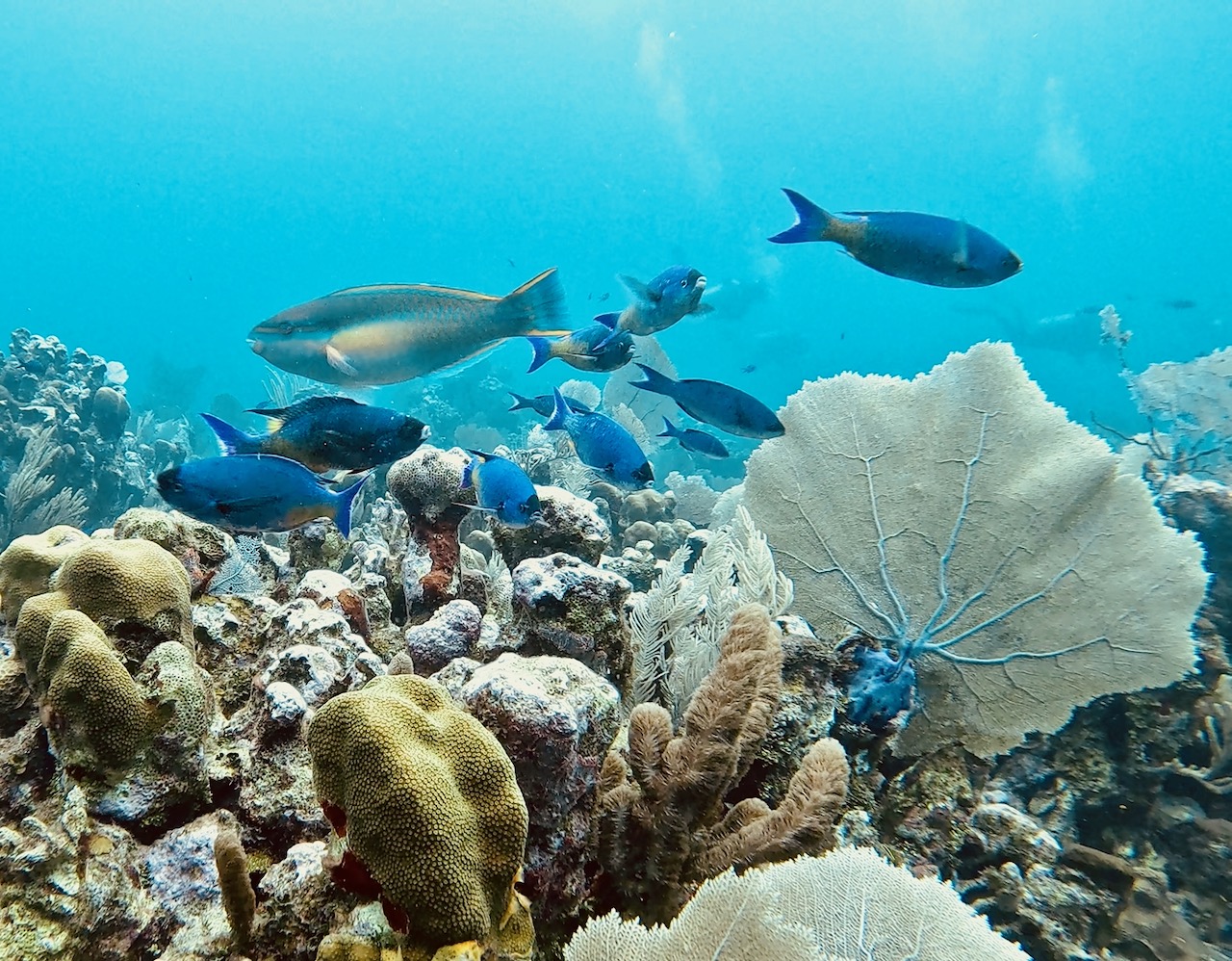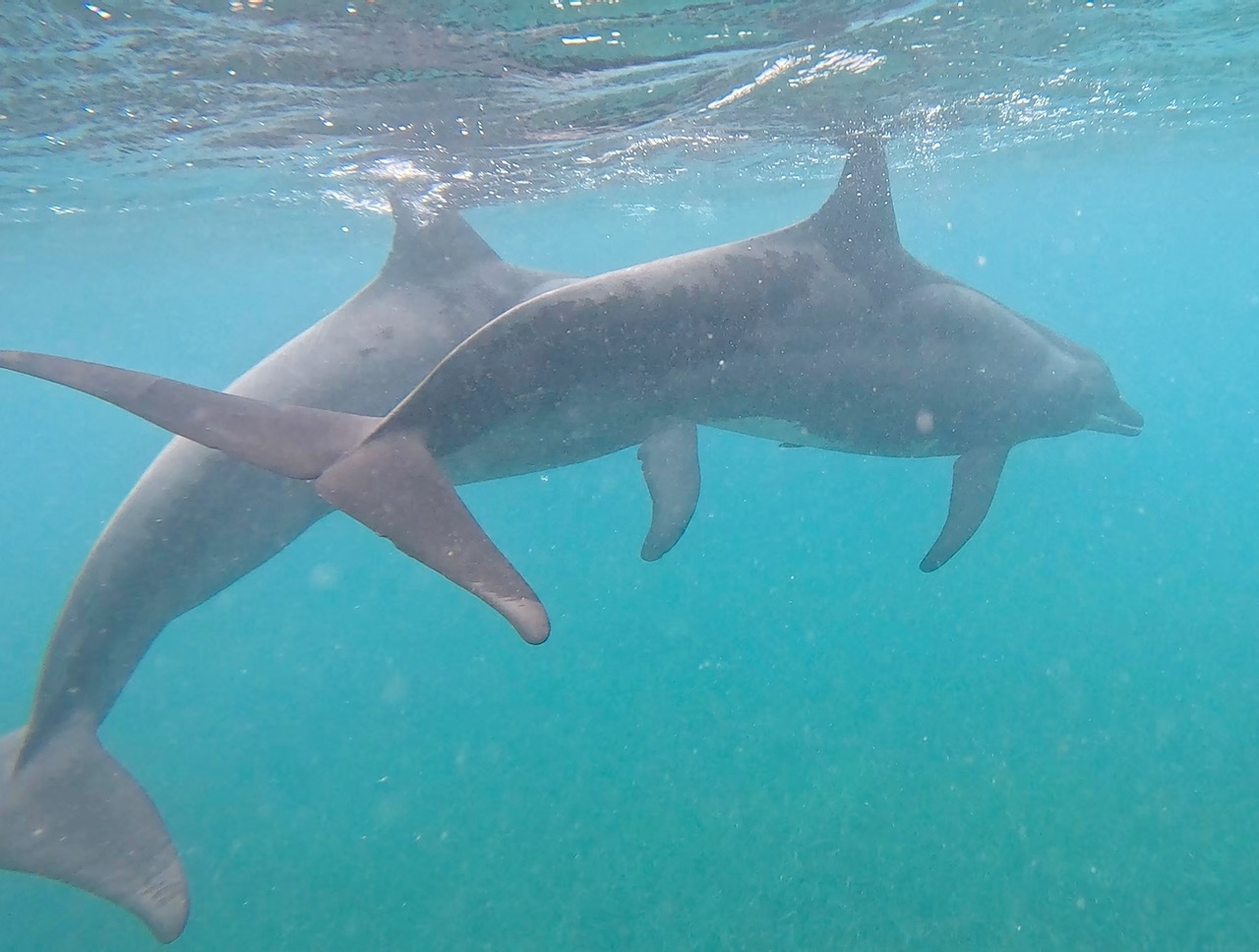 Das Tauchen begeistert uns zunächst nicht so sehr. Natürlich sind die Unterwasser Landschaften fantastisch und die Sicht ist schon einmalig. Doch fragen wir uns, wo die ganzen Fische sind. Wir sind vermutlich einfach zu verwöhnt. Doch am zweiten Tauchtag wird es deutlich besser, es fängt schon damit an, dass wir mit Rauzahn Delfinen schnorcheln. Sie kommen hautnah an uns ran und bleiben sehr lange in unserer Nähe. Einfach ein großartiges Erlebnis. Und die Tauchgänge sind dann auch sehr schön mit tanzenden Adlerrochen und vielen anderen schönen Sichtungen. Also revidieren wir unsere Meinung. Das Tauchen ist doch schön hier – auch wenn wir den einen oder anderen etwas langweiligeren Tauchgang hatten.