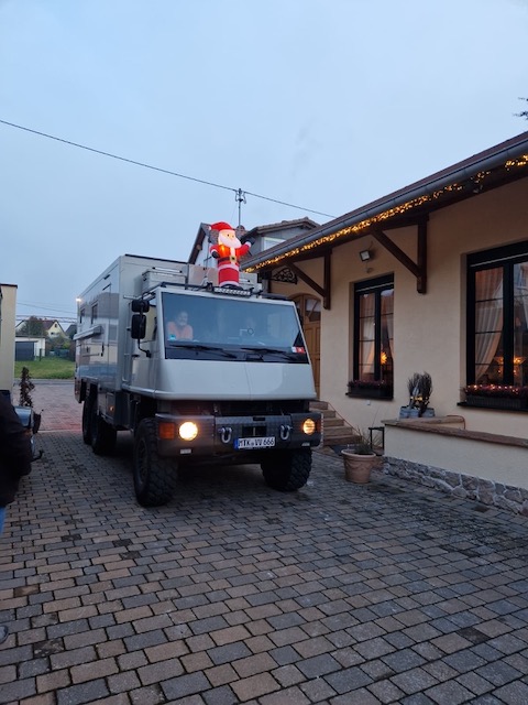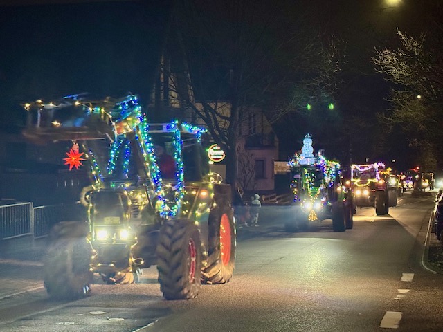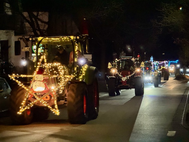 Die letzten Tage in Deutschland waren noch recht hektisch mit ungeplanten (und ungewollten) Arbeiten – dazu das super usselige Wetter – der Abschied fällt also nicht ganz so schwer. An einem unserer letzten Abende in unserem alten Heimatort, wir wollen gerade zu den Toms zum gemeinsamen Pizzaessen laufen, werden wir noch mal positiv überrascht. Über 50 festlich beleuchtete Traktoren fahren anlässlich eines Weihnachtskorsos an uns vorbei. Was ein Erlebnis.