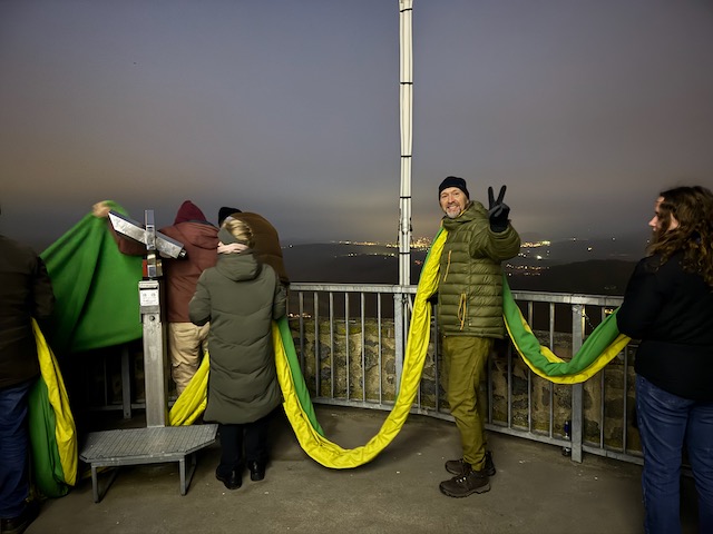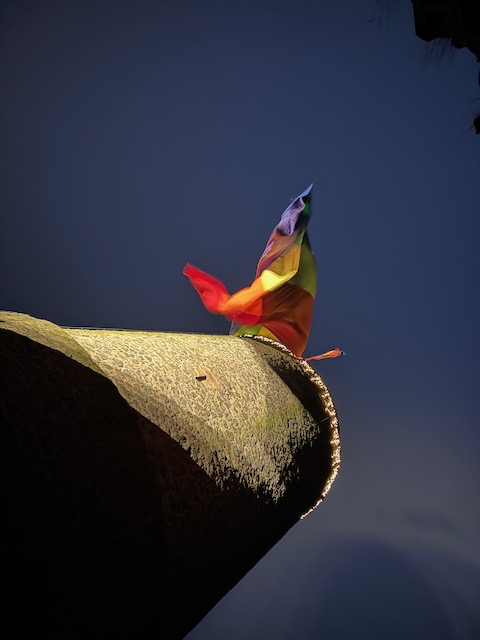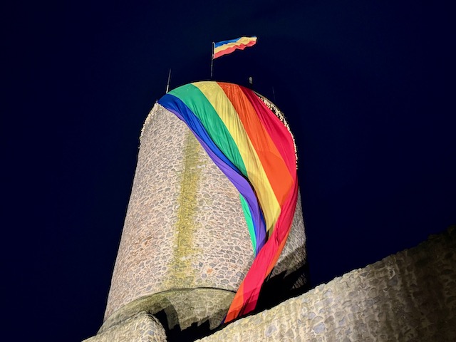 By chance, we hear about a 2,150-square-feet rainbow flag that is going to be hoist on the tower of our local castle. So, on a whim, we walk up to the castle and are delighted to be part of this wonderful, democratic event. About 50 people are here, and everyone helps to carry the huge, 132 pound flag up the 200 steps to the tower, unfurl it, hang it down from the tower, and then fold it back up into a manageable package. A wonderful, peaceful atmosphere with lovely people. We should have more events like this.
