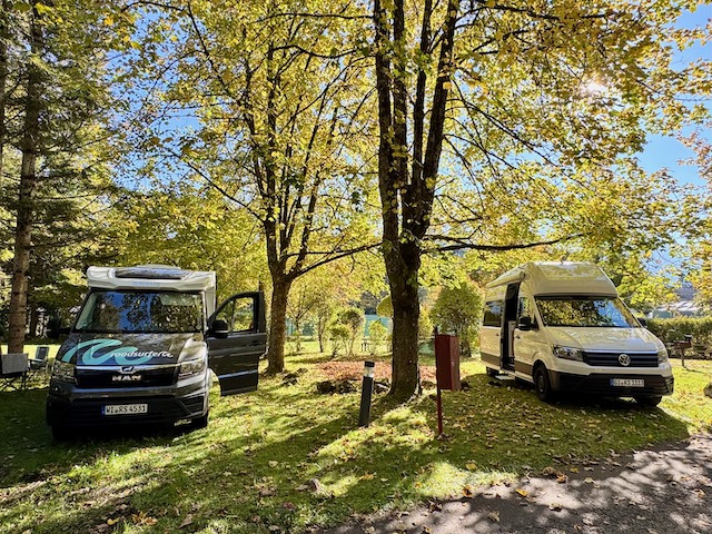 Wir wären jetzt echt bereit mal wieder die Sonne zu sehen und wir haben Glück. Etwa 5 Kilometer vor Garmisch öffnet sich der Himmel und wir sehen diesen blau und sofort wärmt uns die Sonne. Hier treffen wir Rick und Janice (Sandies Cousin und Frau), die zum ersten mal mit einem Camper unterwegs sind. Wir dürfen auf dem Campingplatz der amerikanischen Kaserne campen und das fühlt sich fast an wie in einem Statepark in den USA mit herrlichem Alpen Panorama. Wir genießen Garmisch und die amerikanische Umgebung. Doch als Rick und Janice wieder Richtung Heimat fahren, müssen auch wir die Kaserne verlassen.