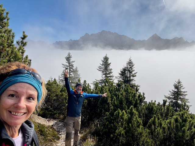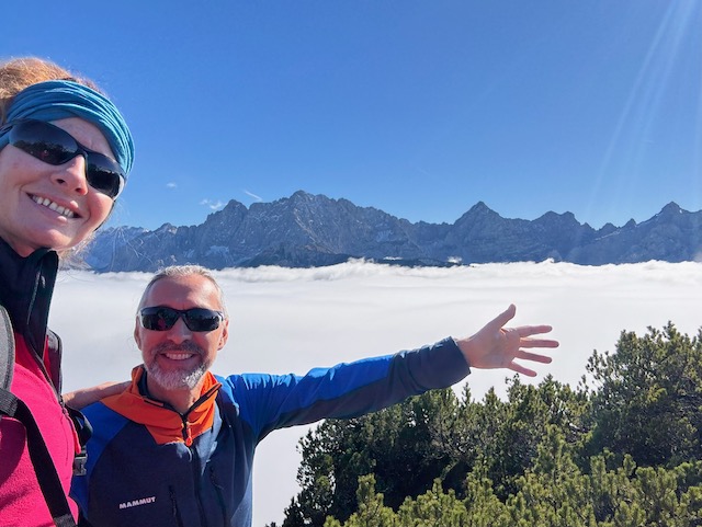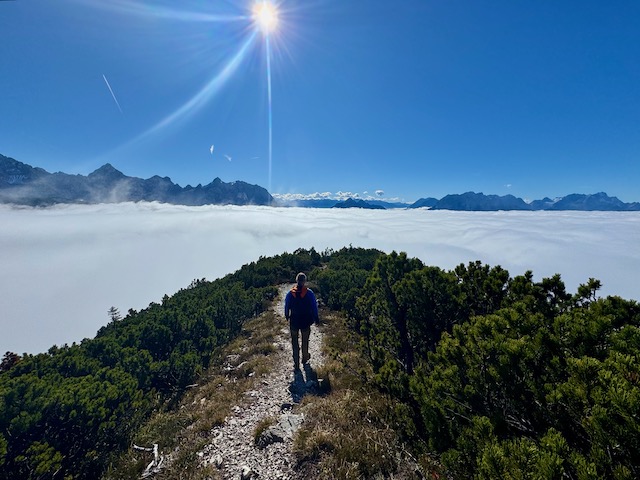 Wir erkunden Mittenwald, trinken Cafe in der Sonne und lassen es uns gut gehen. Am nächsten Tag ist dann aber wieder dieser Nebel bzw. Wolken da. Egal, wir wollen wandern und nehmen den Lausberg (1.854 m) in Angriff. Erst geht es entlang einer Klamm und dann über Bergwiesen und durch zauberhafte Wälder. Das Wetter ist uns wurst – wir genießen es einfach wieder mal in unserem Element zu sein. Doch dann, nach knapp 1.000 Höhenmetern sind wir über den Wolken. Es wird schlagartig warm, wir brauchen die Sonnenbrillen und die Aussichten sind einfach phänomenal. Uns gehen die Herzen über! Eine wunderschöne Wanderung.