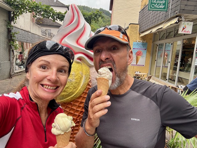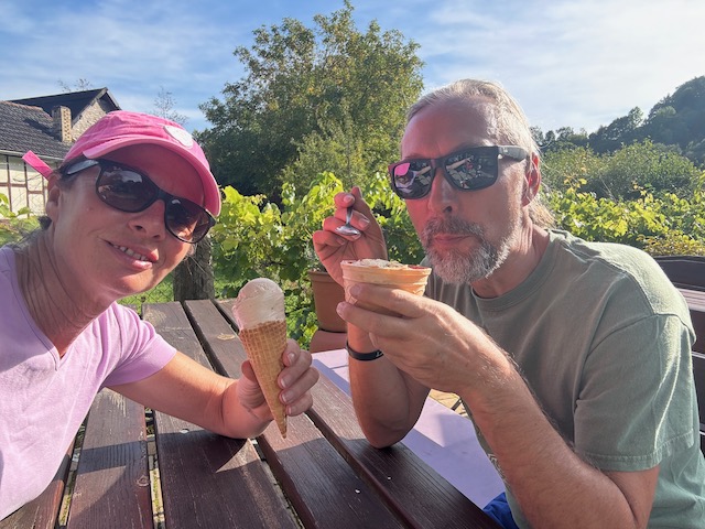 Das Wetter ist mehr oder weniger die ganze Zeit, um es nicht ganz so negativ auszudrücken, durchwachsen. Doch dann scheint die Sonne und Karsten packt sofort unseren Oldie aus und wir genießen einen kleinen Ausflug einschließlich Einkehr in die Eisdiele. Das hat uns schon ein wenig gefehlt.